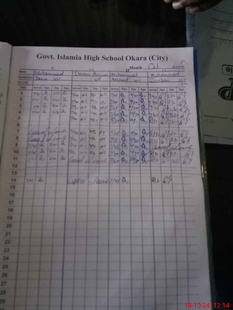 | CNIC | Full Name | Designation | R/C | Absence During Last Calender Month |