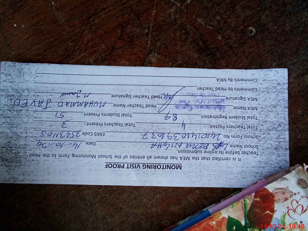 | Certified that this School was Inspected by the Undersigned MEA/DMO Today and the Information Stated Above is as Per Record. | |||||