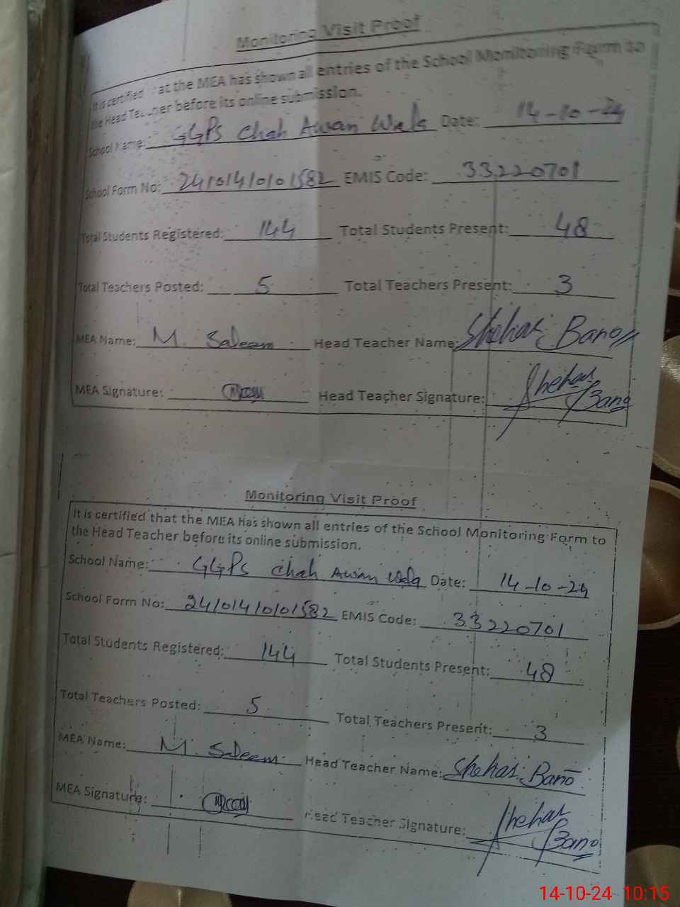 | Attendance Register | Head Teacher | MEA with School | Visit Proof |