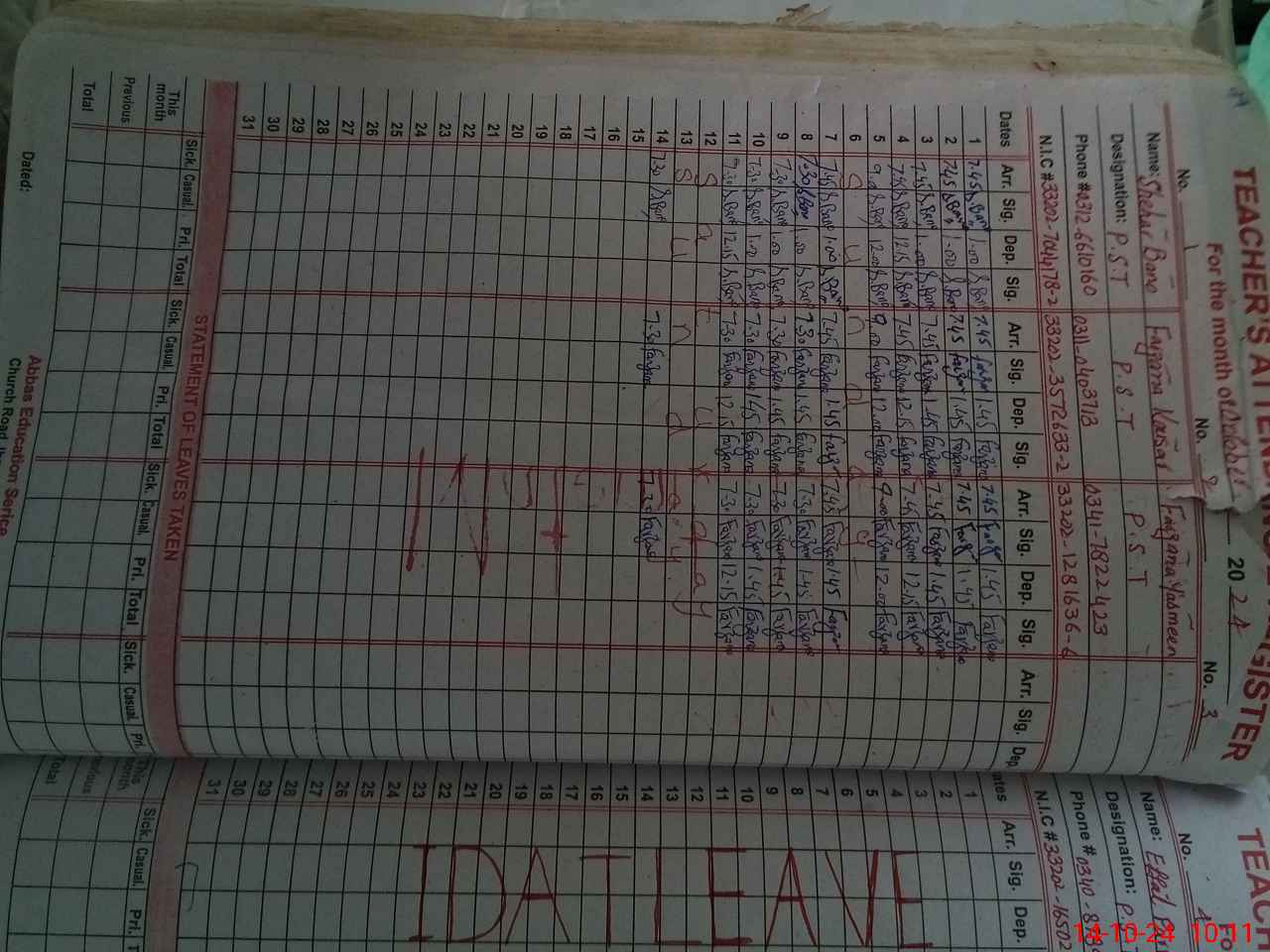 | CNIC | Full Name | Designation | R/C | Absence During Last Calender Month |