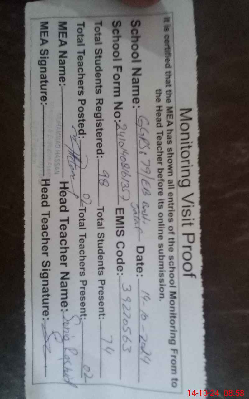 | EMIS Code: 39220563 | Name of School: GGPS 79/EB III basti jalal | |||