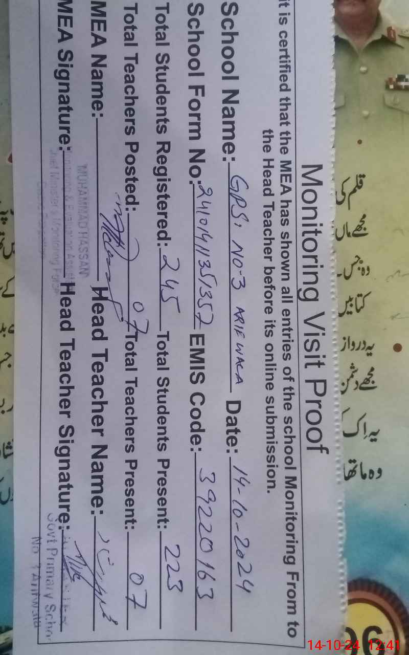 | EMIS Code: 39220163 | Name of School: GPS NO. 3 ARIFWALA | |||