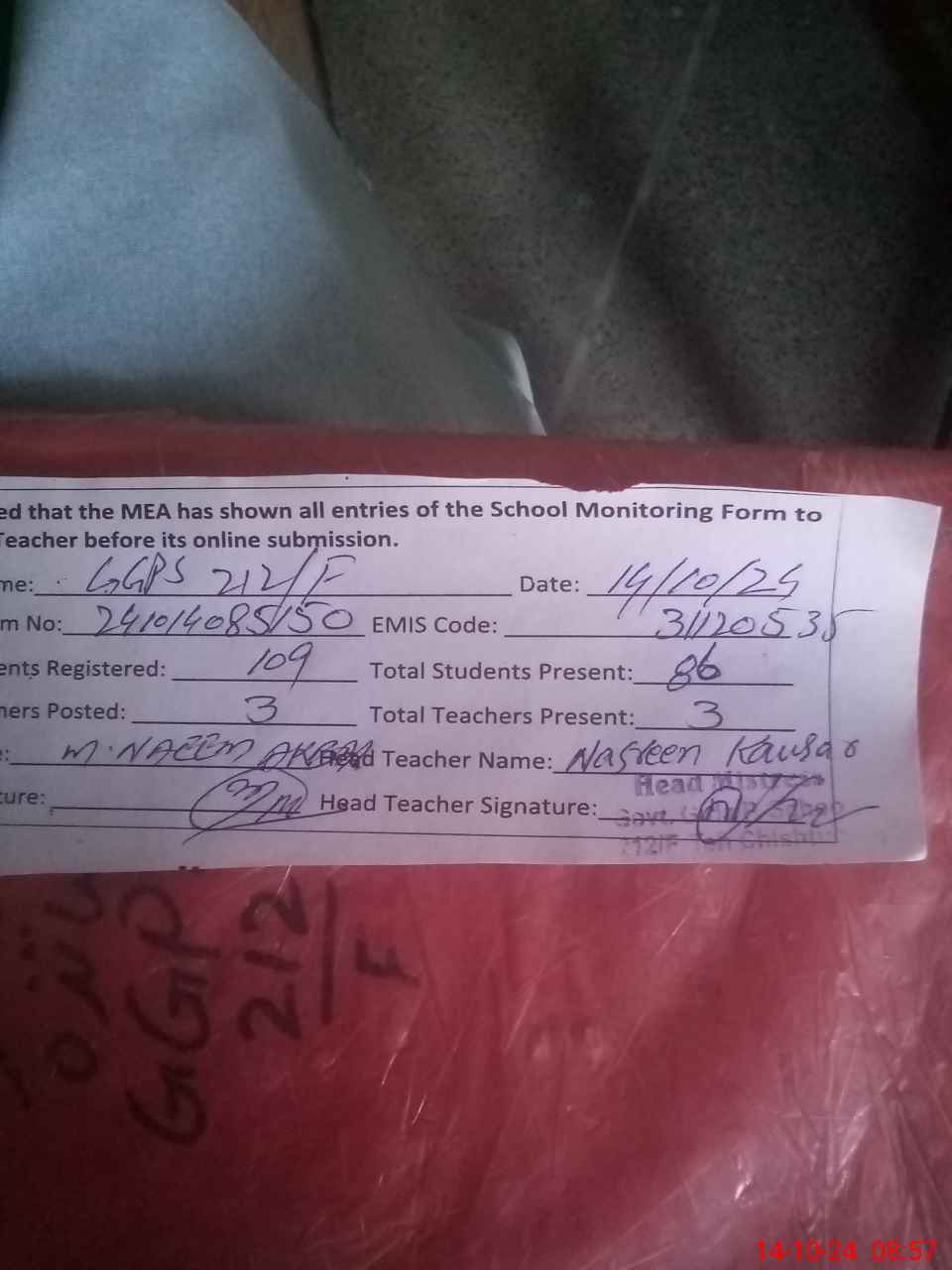 | Attendance Register | Head Teacher | MEA with School | Visit Proof |