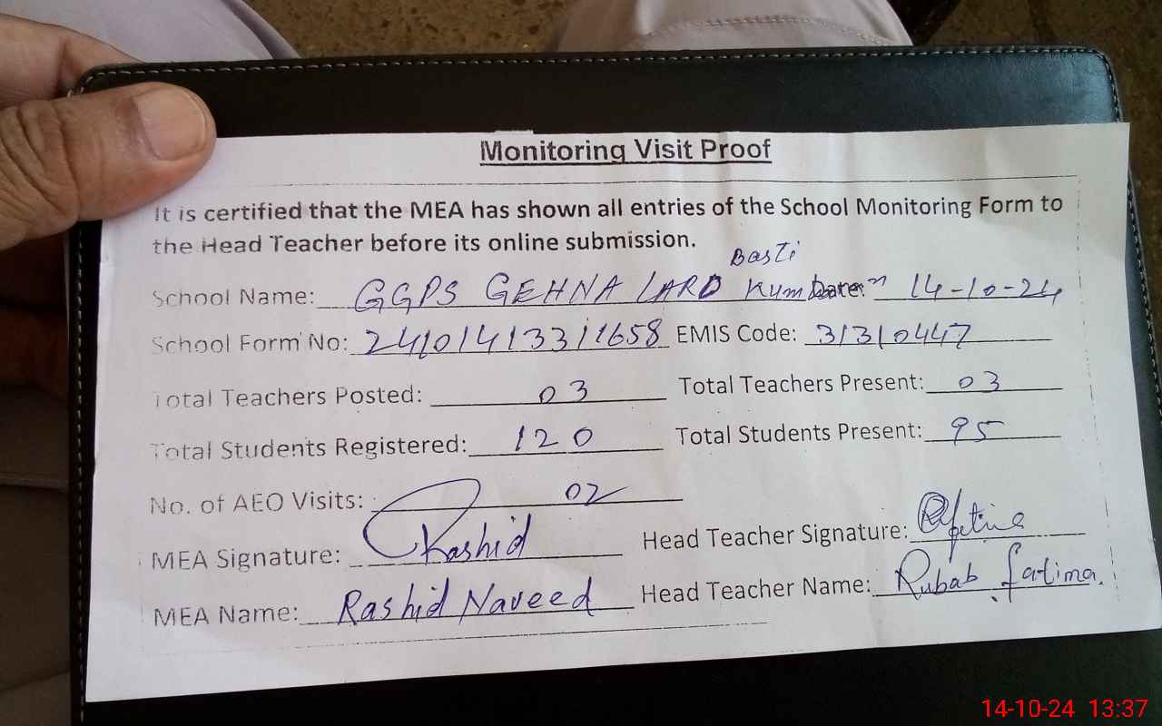 | Certified that this School was Inspected by the Undersigned MEA/DMO Today and the Information Stated Above is as Per Record. | |||||