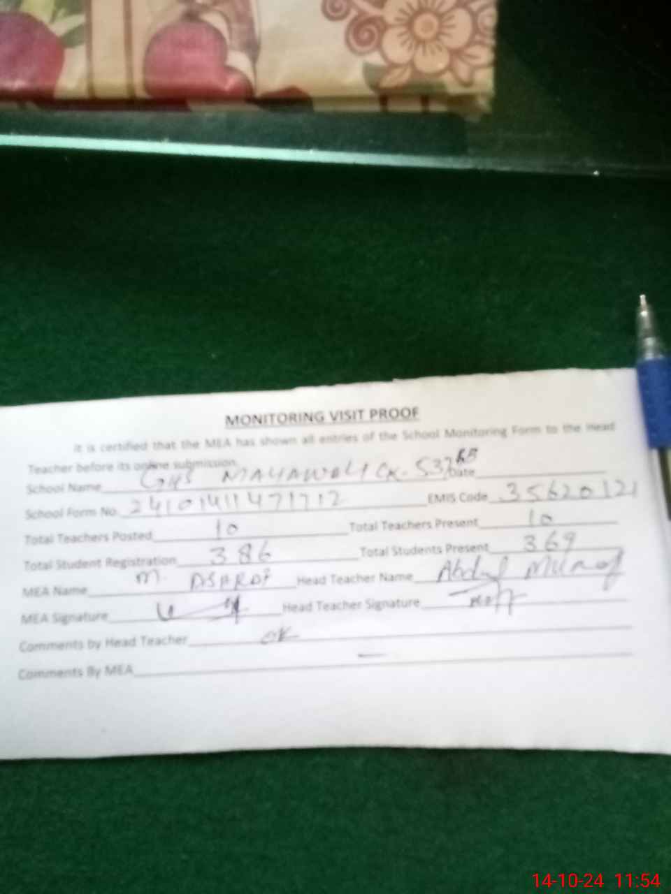 | Attendance Register | Head Teacher | MEA with School | Visit Proof |