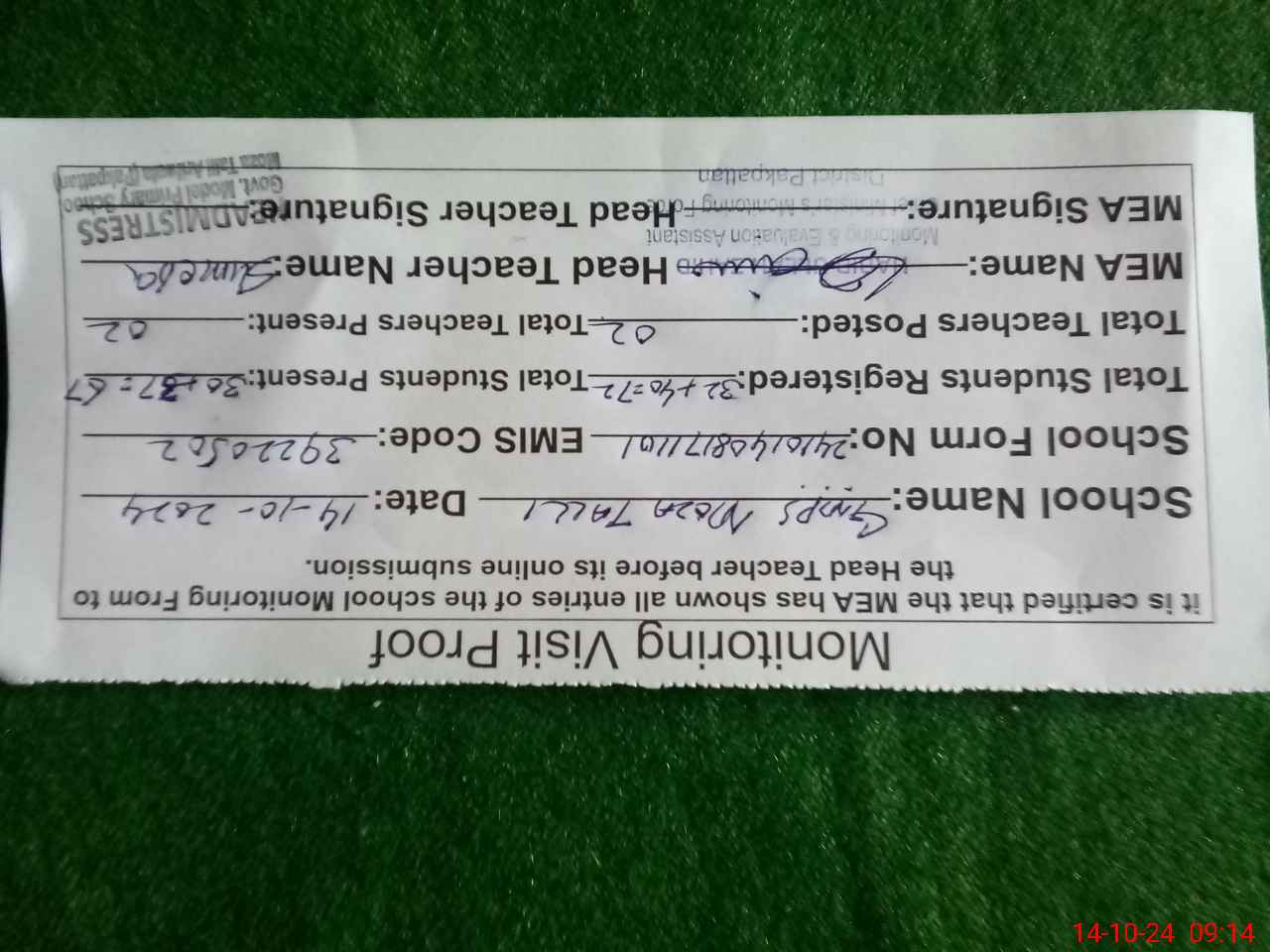| Certified that this School was Inspected by the Undersigned MEA/DMO Today and the Information Stated Above is as Per Record. | |||||