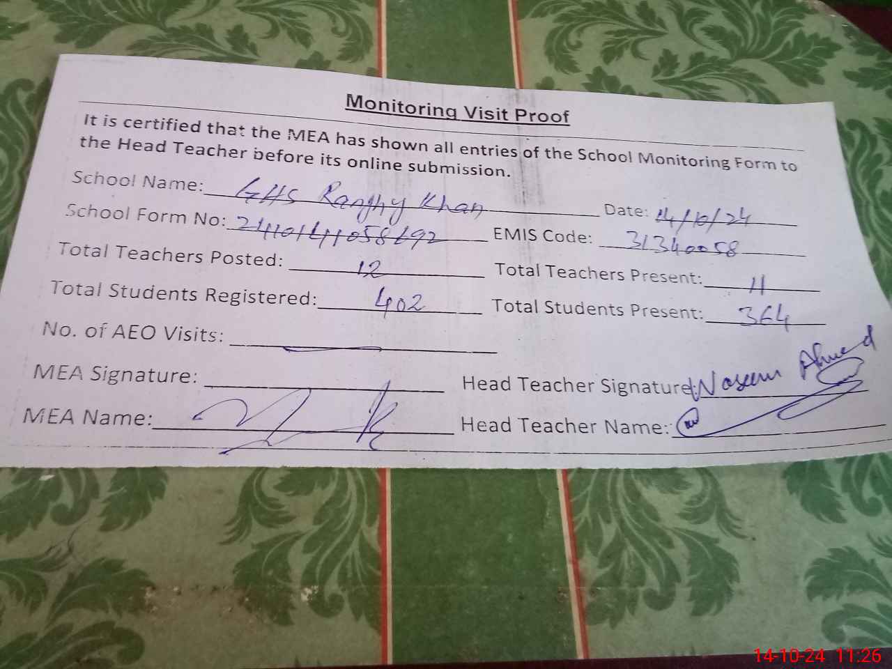 | Attendance Register | Head Teacher | MEA with School | Visit Proof |
