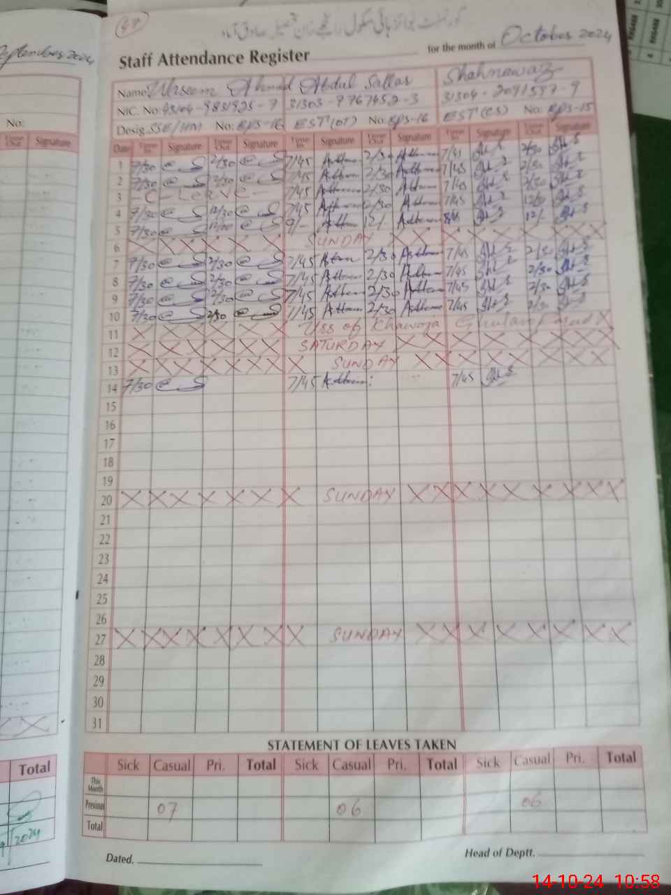 | CNIC | Full Name | Designation | R/C | Absence During Last Calender Month |