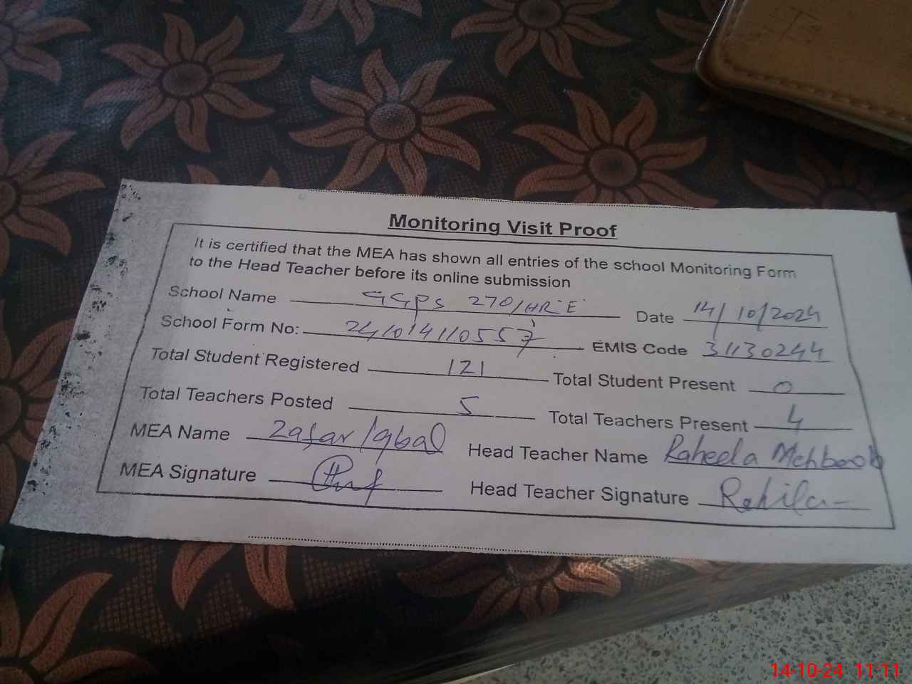 | Attendance Register | Head Teacher | MEA with School | Visit Proof |
