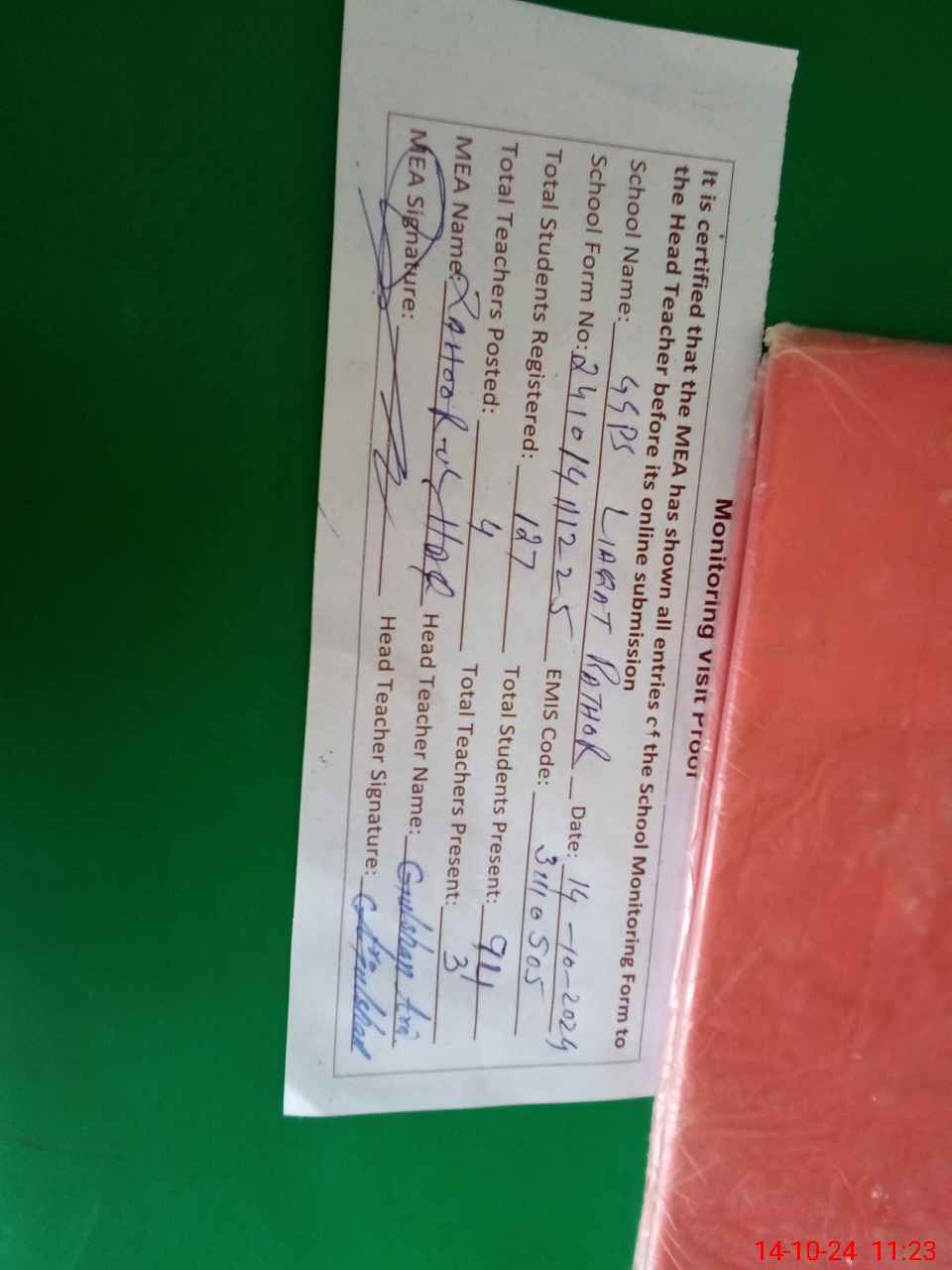 | Attendance Register | Head Teacher | MEA with School | Visit Proof |