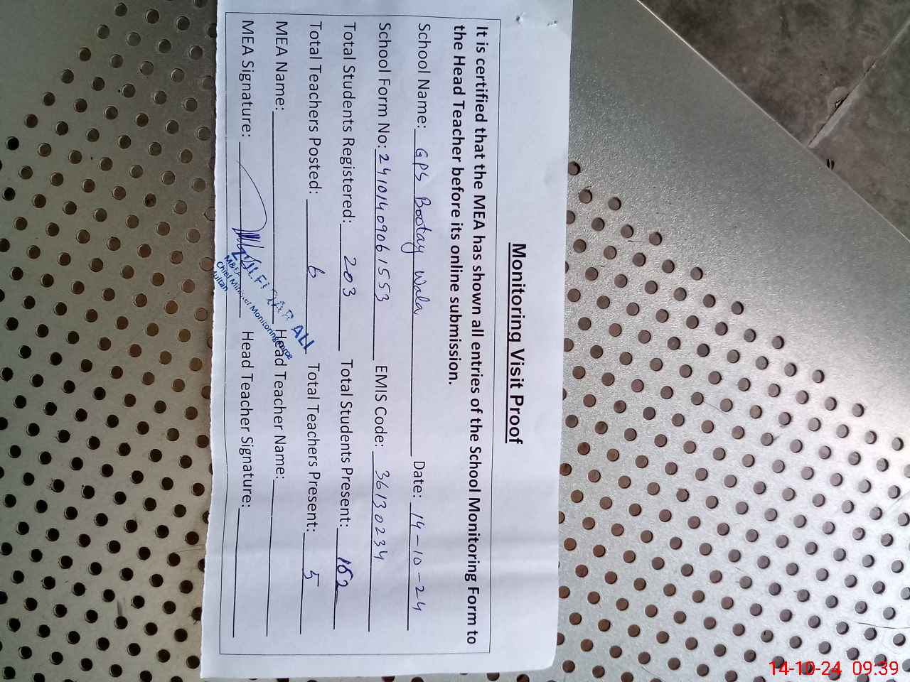 | Attendance Register | Head Teacher | MEA with School | Visit Proof |