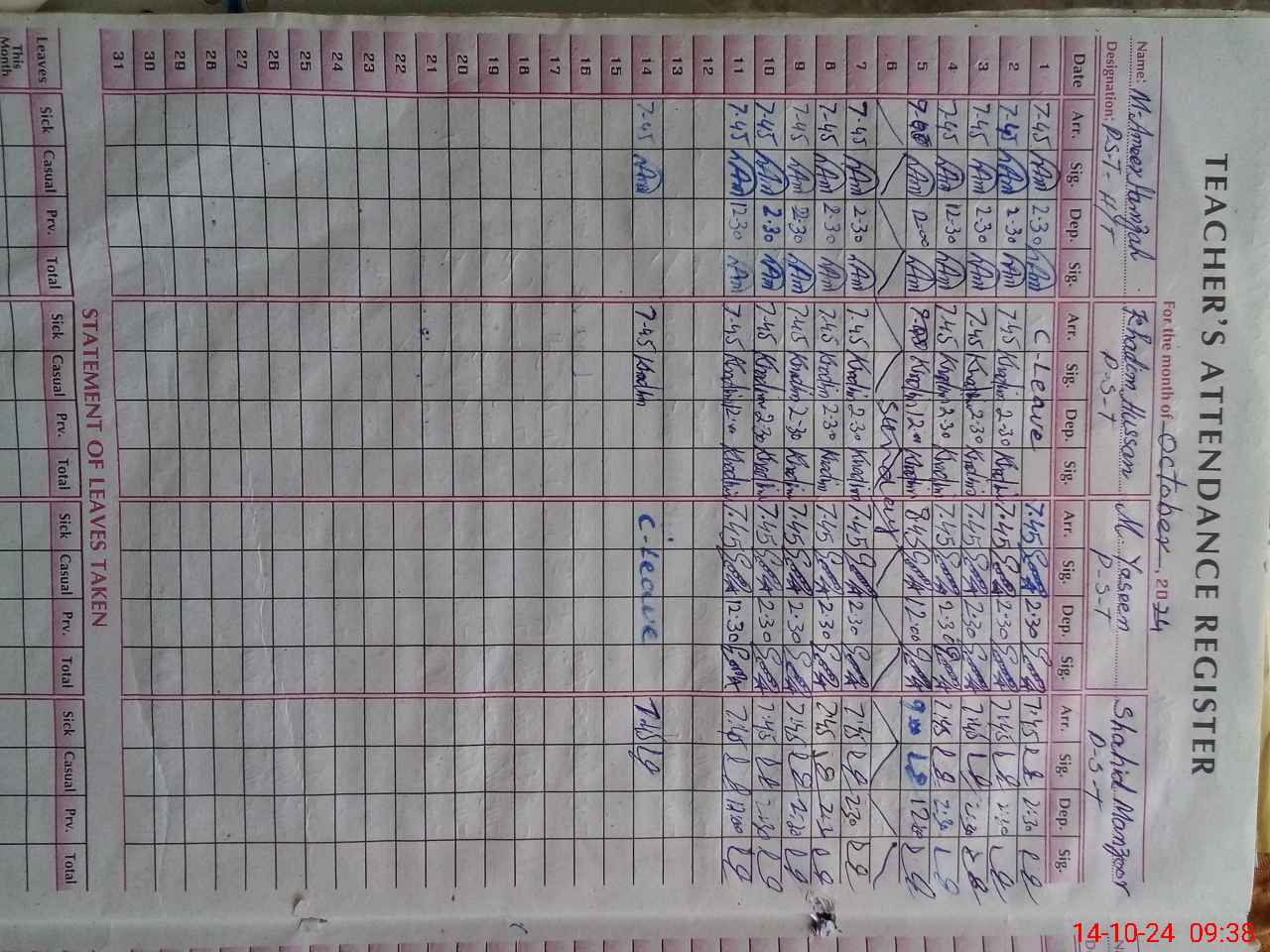 | CNIC | Full Name | Designation | R/C | Absence During Last Calender Month |