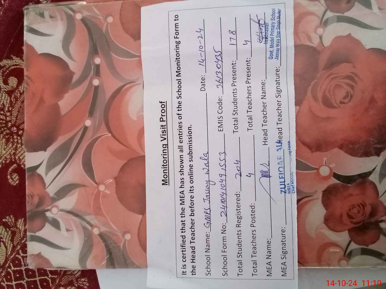 | Attendance Register | Head Teacher | MEA with School | Visit Proof |