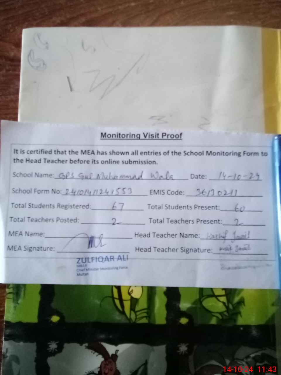 | EMIS Code: 36130211 | Name of School: GPS GUL MUHAMMAD WALA MULTAN | |||