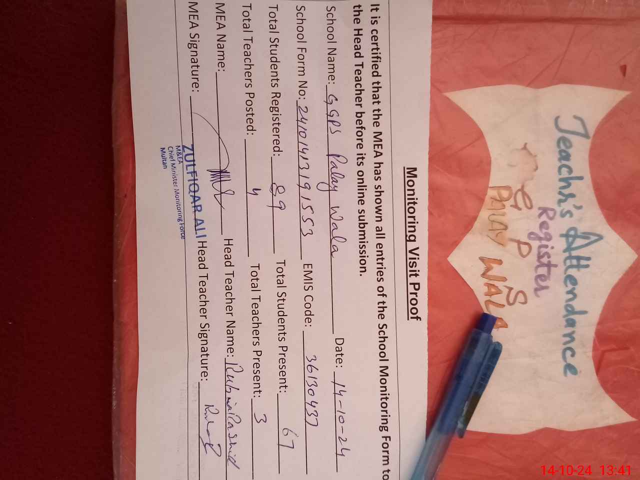 | Attendance Register | Head Teacher | MEA with School | Visit Proof |