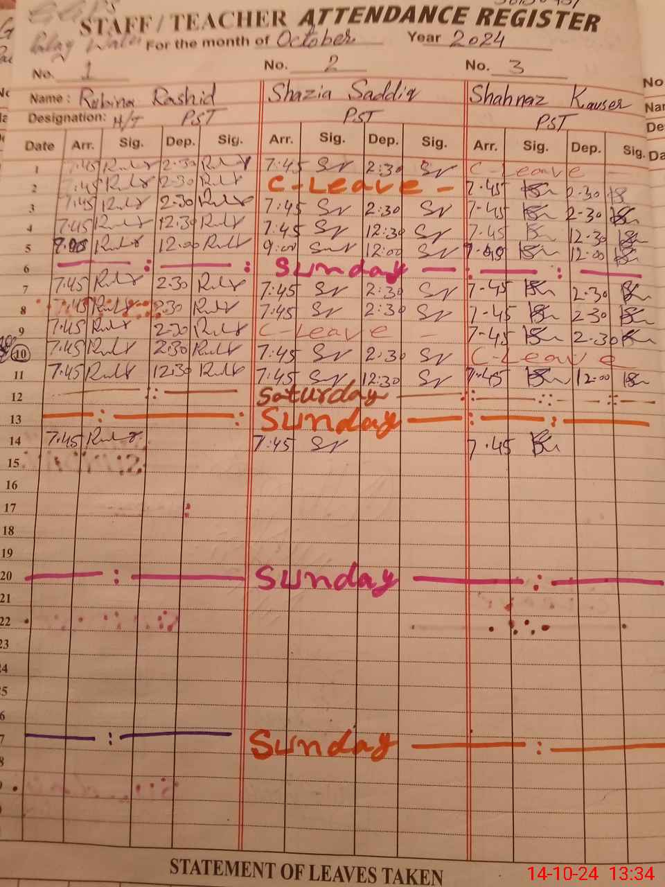 | CNIC | Full Name | Designation | R/C | Absence During Last Calender Month |