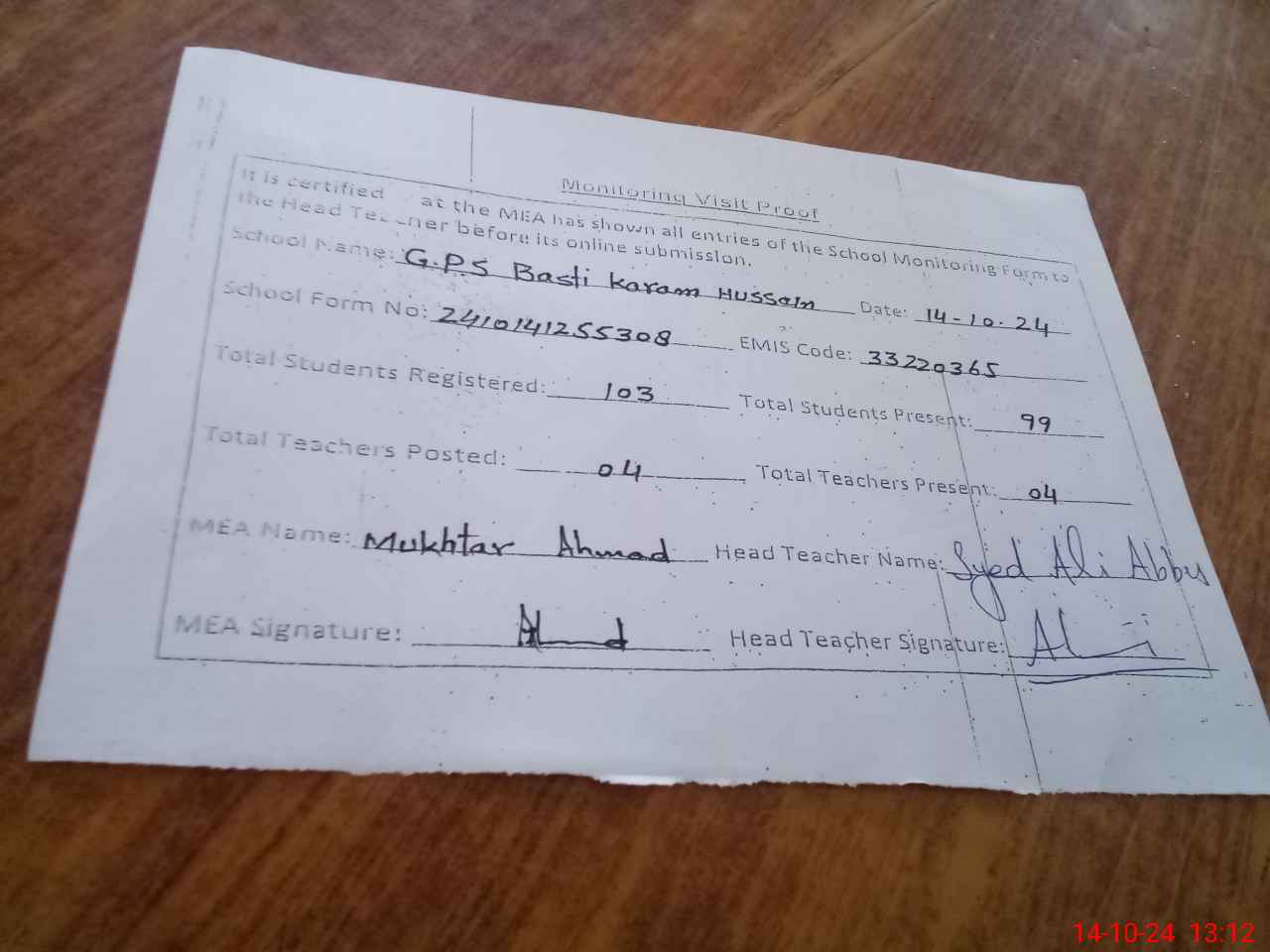 | Attendance Register | Head Teacher | MEA with School | Visit Proof |