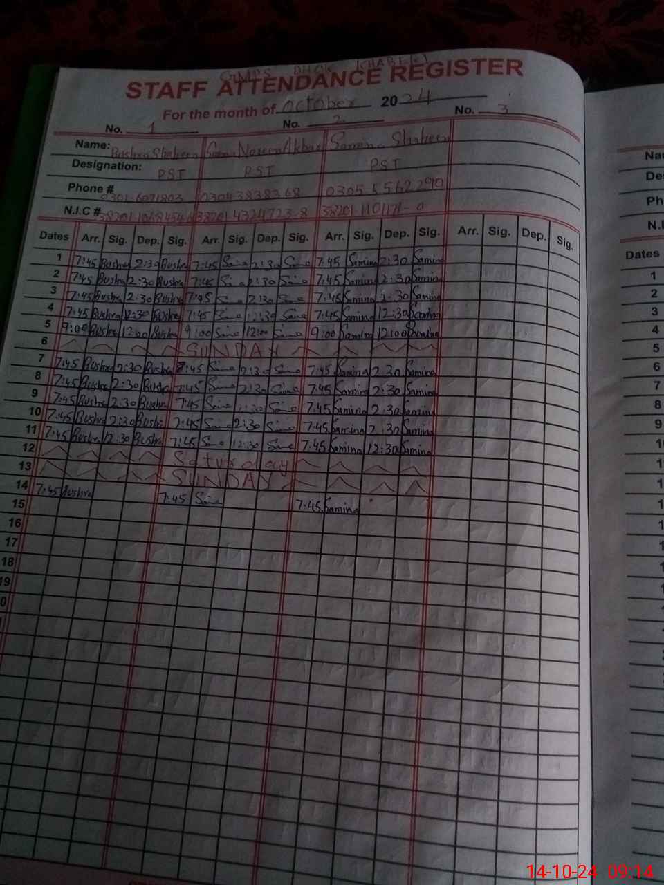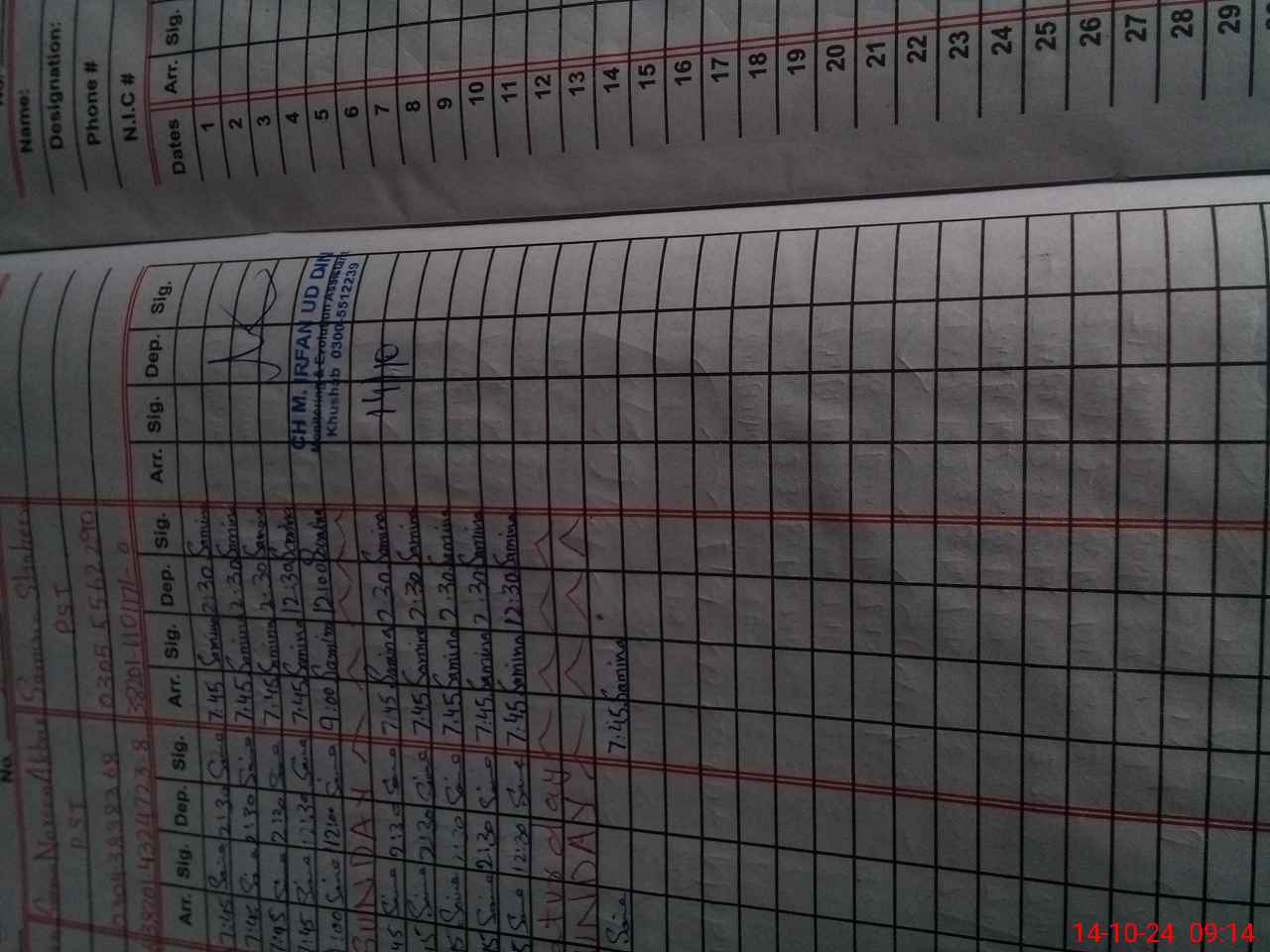 | CNIC | Full Name | Designation | R/C | Absence During Last Calender Month |