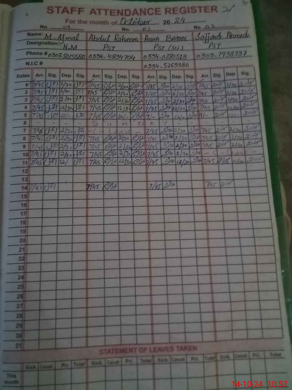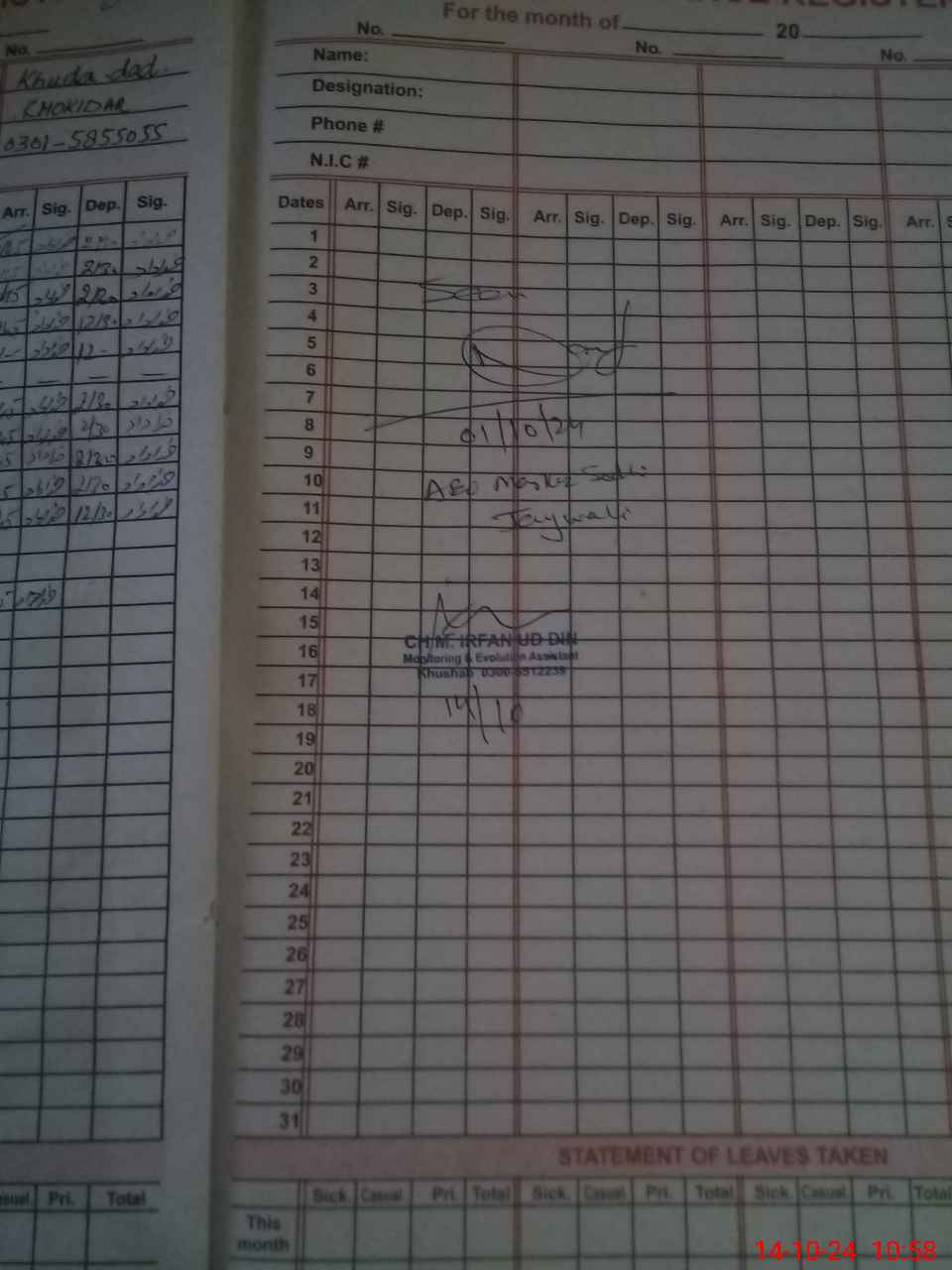 | CNIC | Full Name | Designation | R/C | Absence During Last Calender Month |