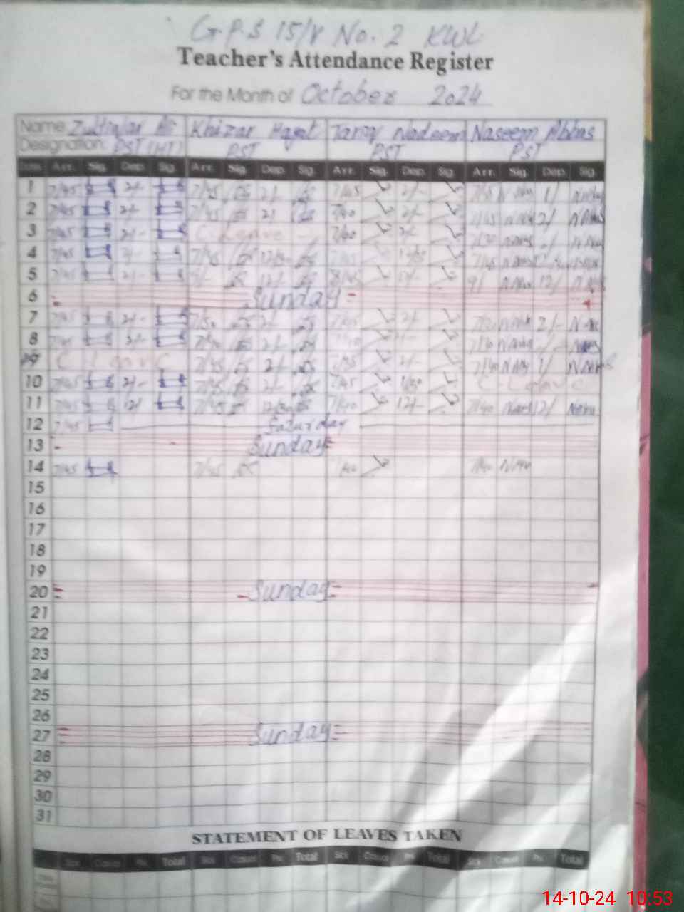 | Remarks (Use Separate Page if Required): 01 PST teacher Sana Hassan showing on casual leave on attendence register where as online leave not applied so that she is absent | |||||