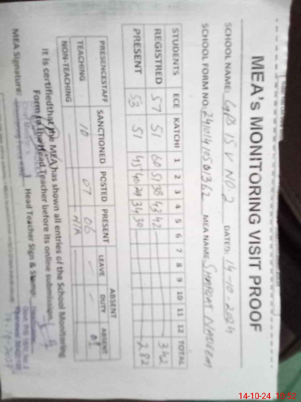 | Attendance Register | Head Teacher | MEA with School | Visit Proof |
