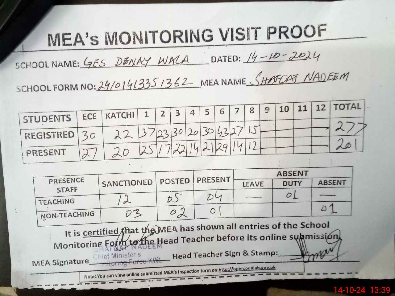 | Attendance Register | Head Teacher | MEA with School | Visit Proof |