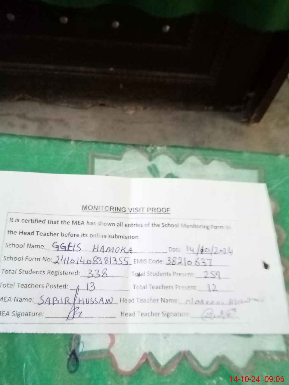 | Certified that this School was Inspected by the Undersigned MEA/DMO Today and the Information Stated Above is as Per Record. | |||||