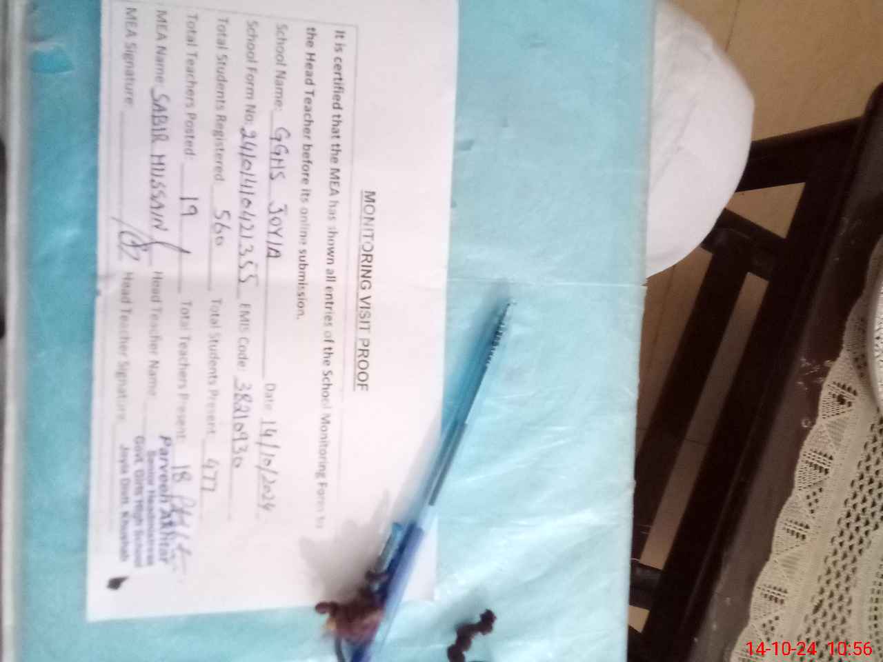| Certified that this School was Inspected by the Undersigned MEA/DMO Today and the Information Stated Above is as Per Record. | |||||