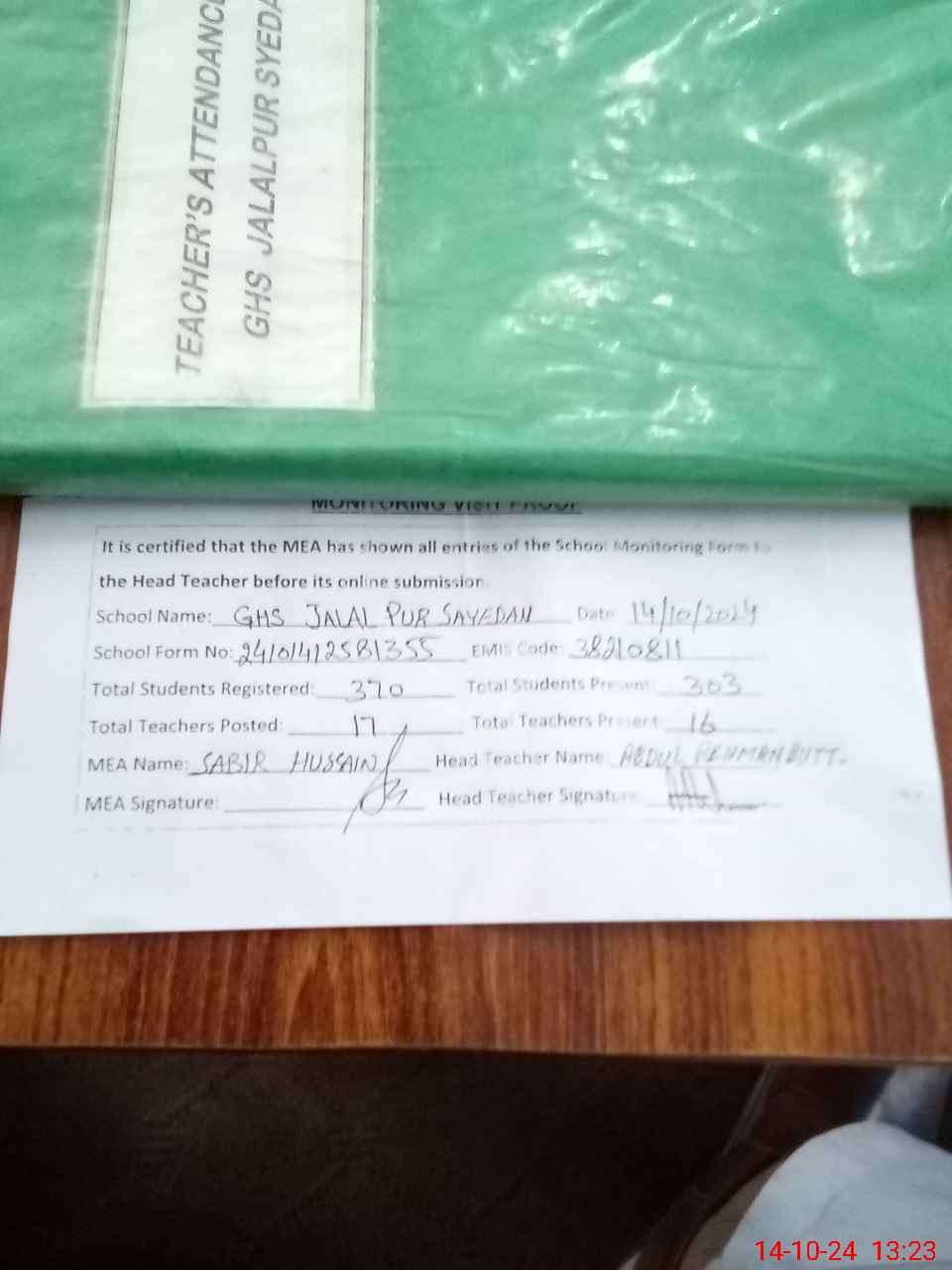 | Certified that this School was Inspected by the Undersigned MEA/DMO Today and the Information Stated Above is as Per Record. | |||||