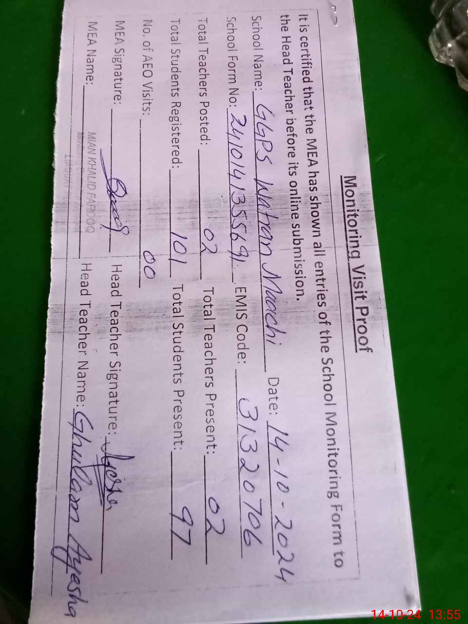 | Attendance Register | Head Teacher | MEA with School | Visit Proof |