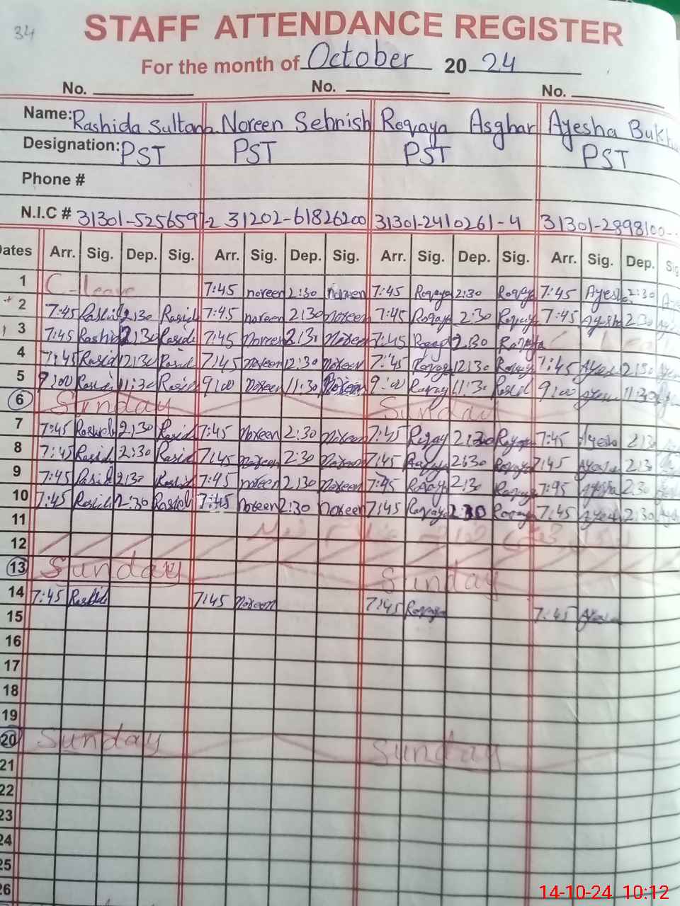 | CNIC | Full Name | Designation | R/C | Absence During Last Calender Month |