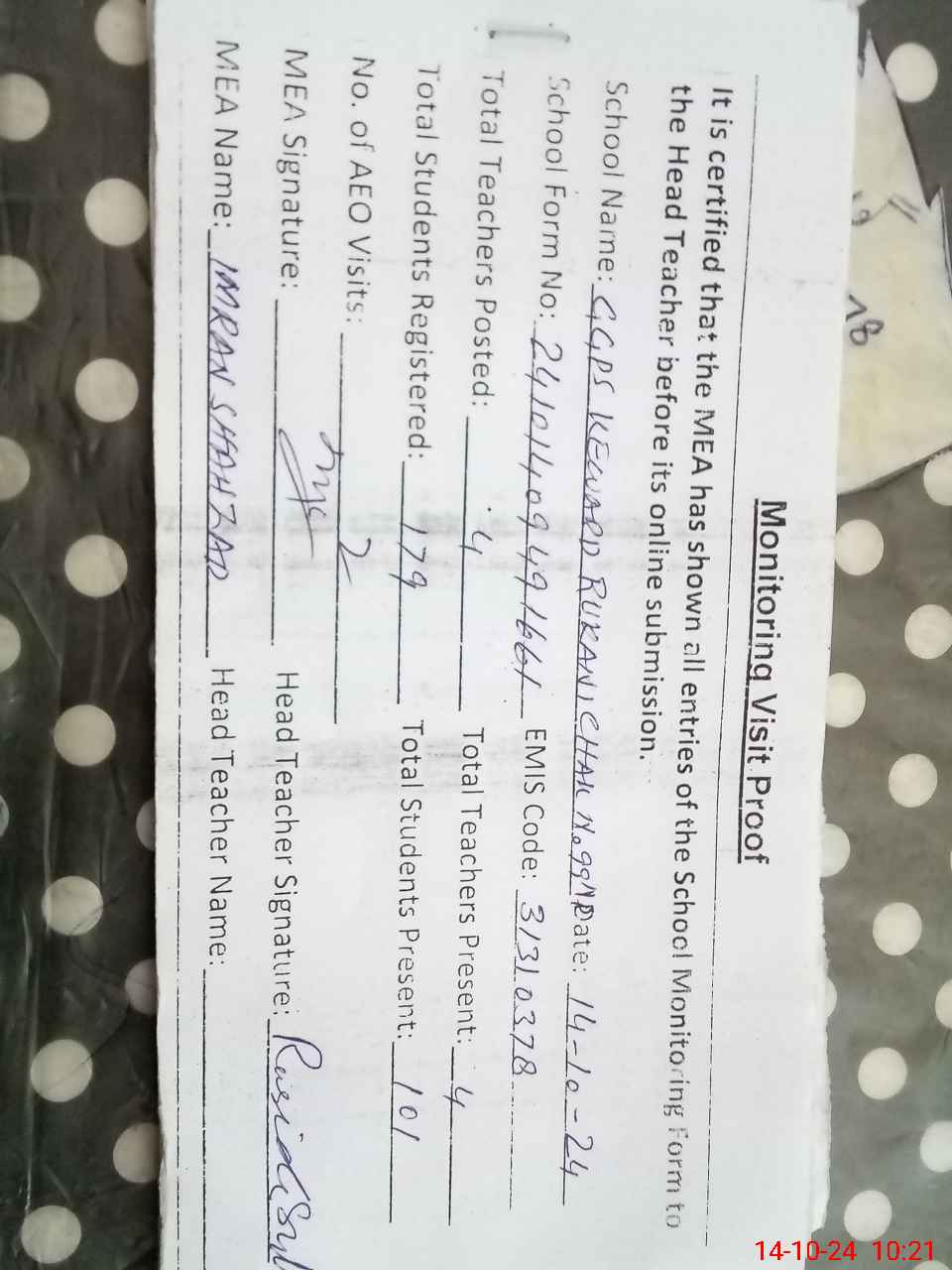| Monitoring Date: 14-10-2024 | Start Time: 14-10-2024 09:49 AM | End Time: 14-10-2024 10:22 AM | Name of MEA: Im**** Sh**** | |
