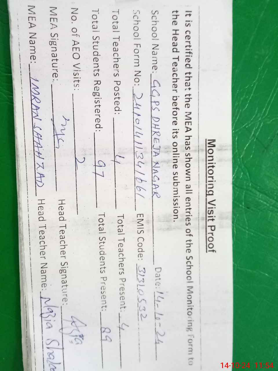 | Attendance Register | Head Teacher | MEA with School | Visit Proof |