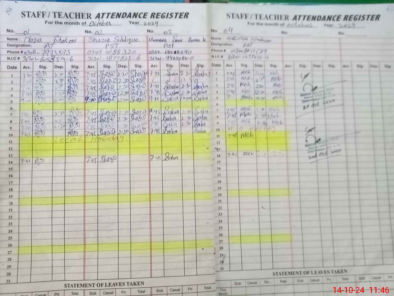 | CNIC | Full Name | Designation | R/C | Absence During Last Calender Month |