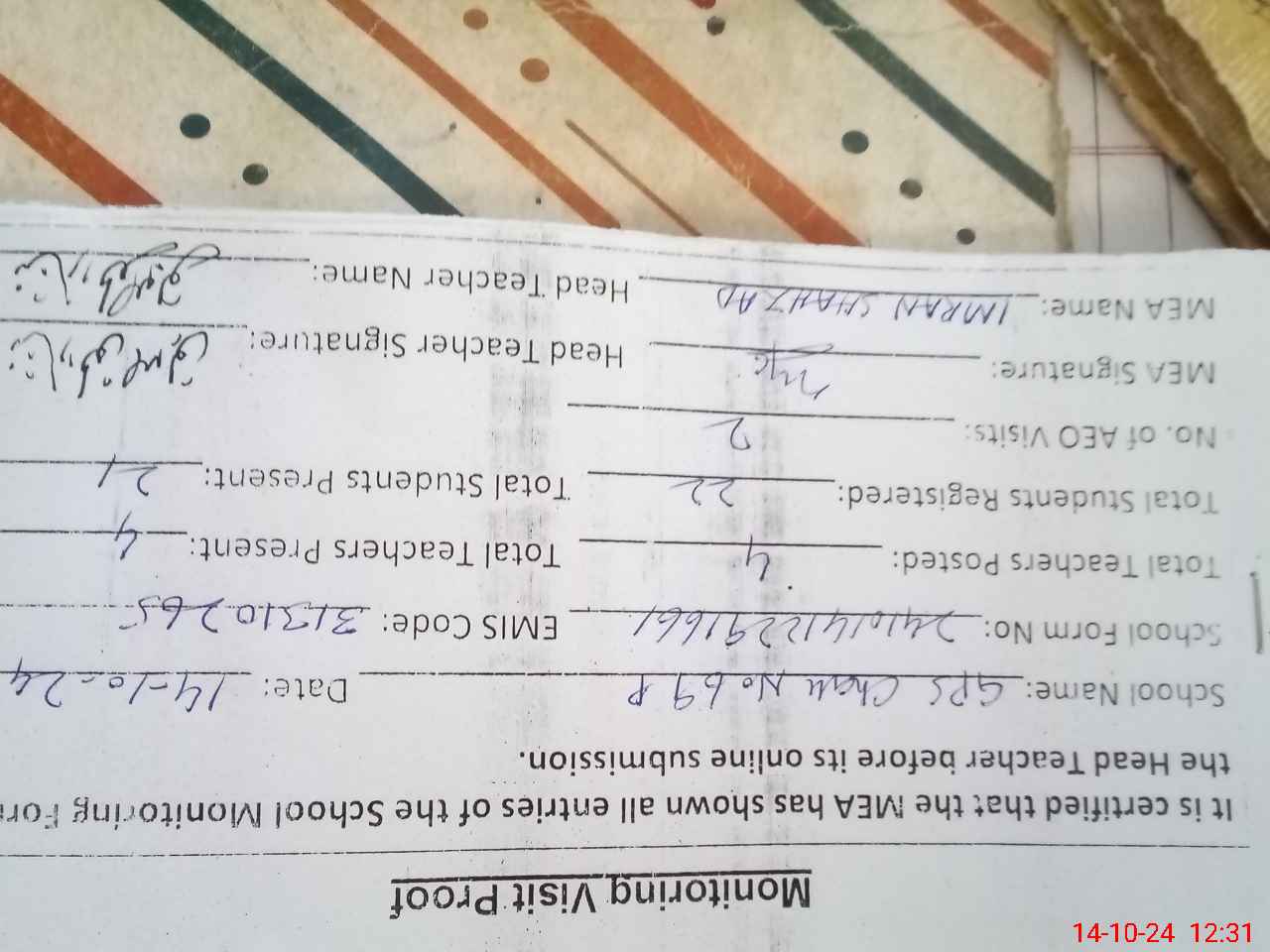 | Certified that this School was Inspected by the Undersigned MEA/DMO Today and the Information Stated Above is as Per Record. | |||||