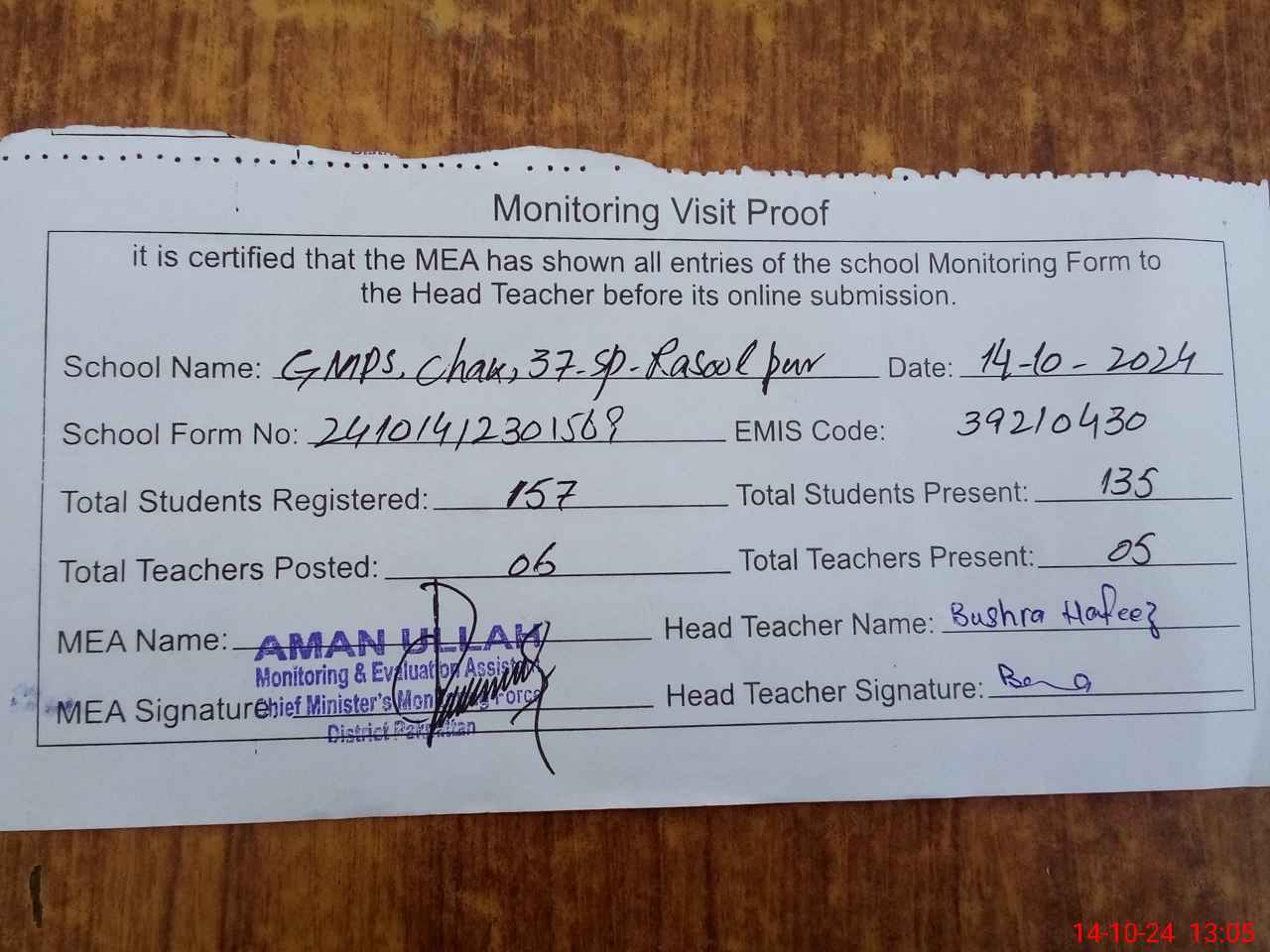 | Attendance Register | Head Teacher | MEA with School | Visit Proof |