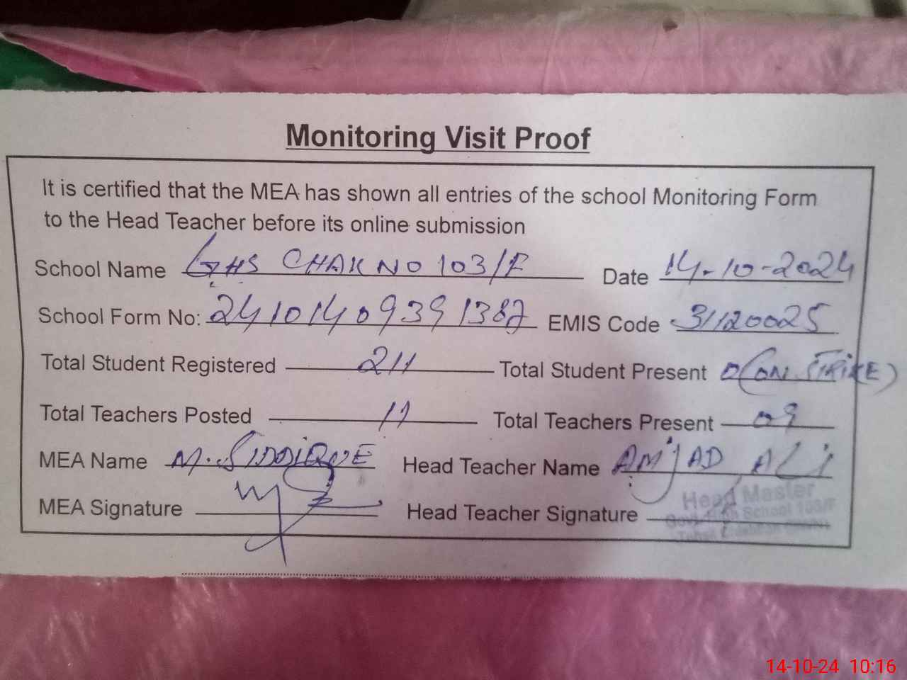 | Certified that this School was Inspected by the Undersigned MEA/DMO Today and the Information Stated Above is as Per Record. | |||||