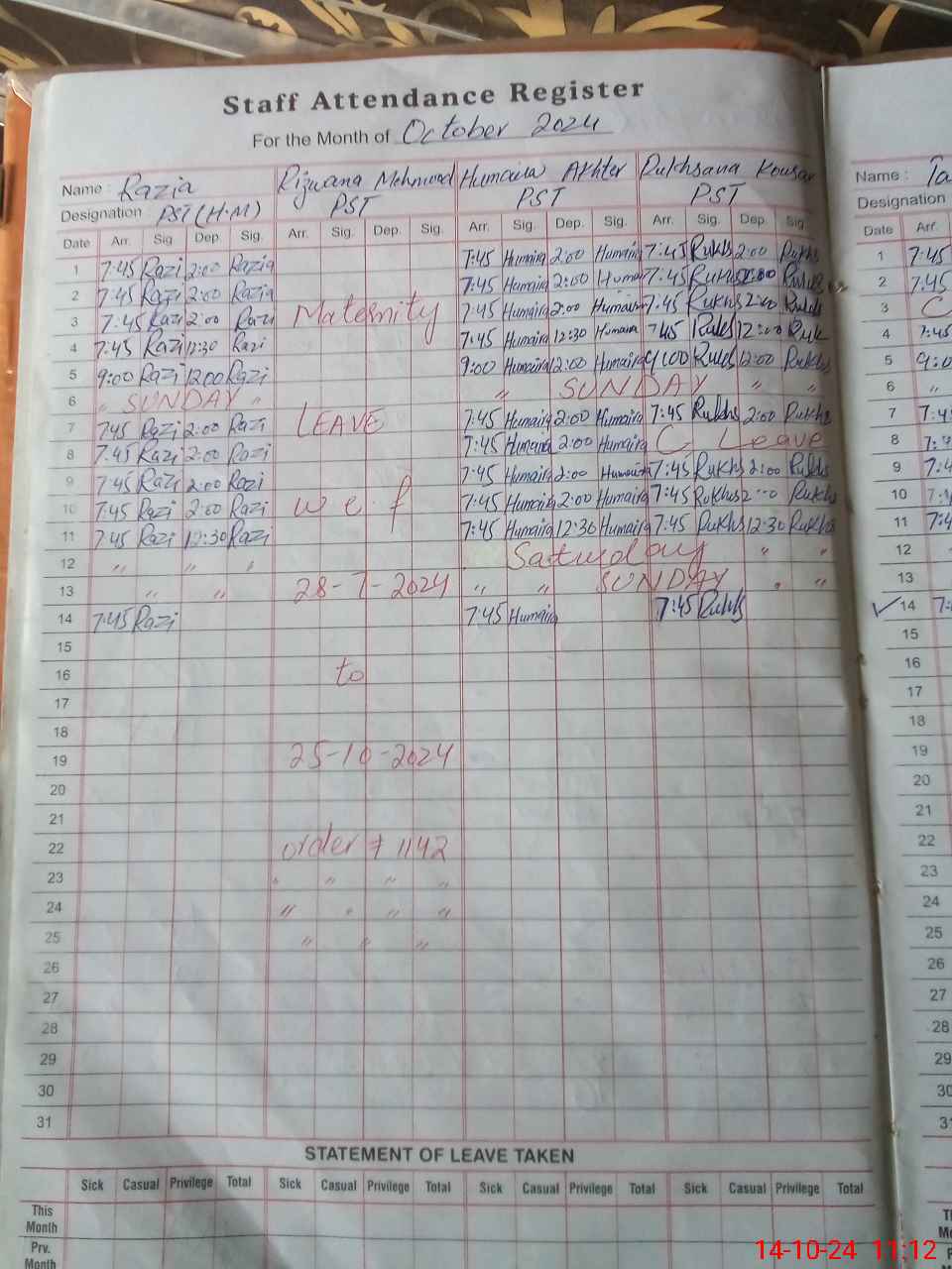 | 35**** | Ri**** Me**** | 1 | 30 | 0 | 0 | 0 | 0 | 0 | 0 | 0 | 30 | Maternity | |