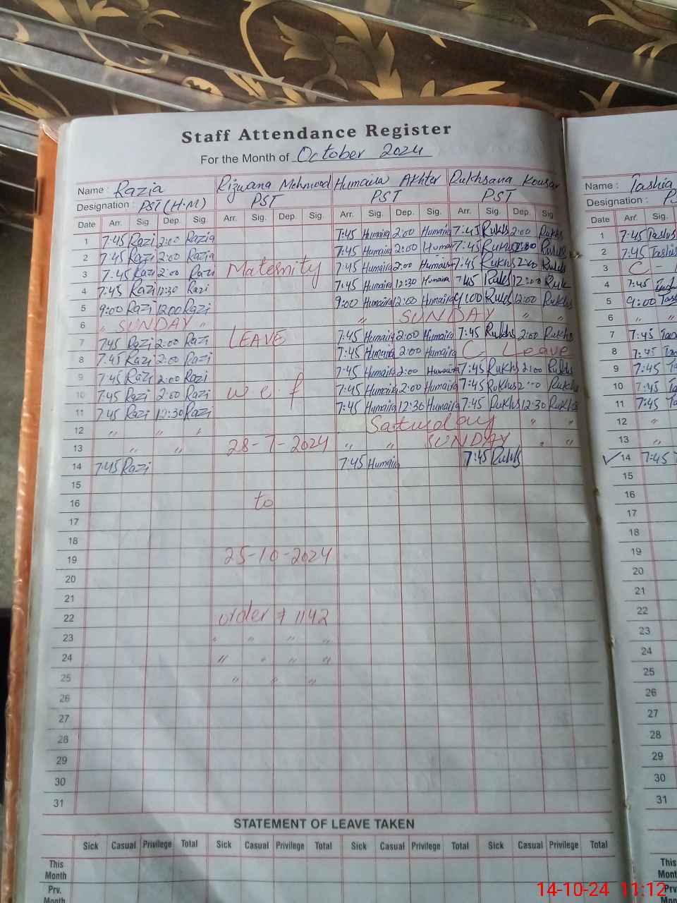 | Leave | Duty | Absent | Maternity | Medical | Ex- Pak |