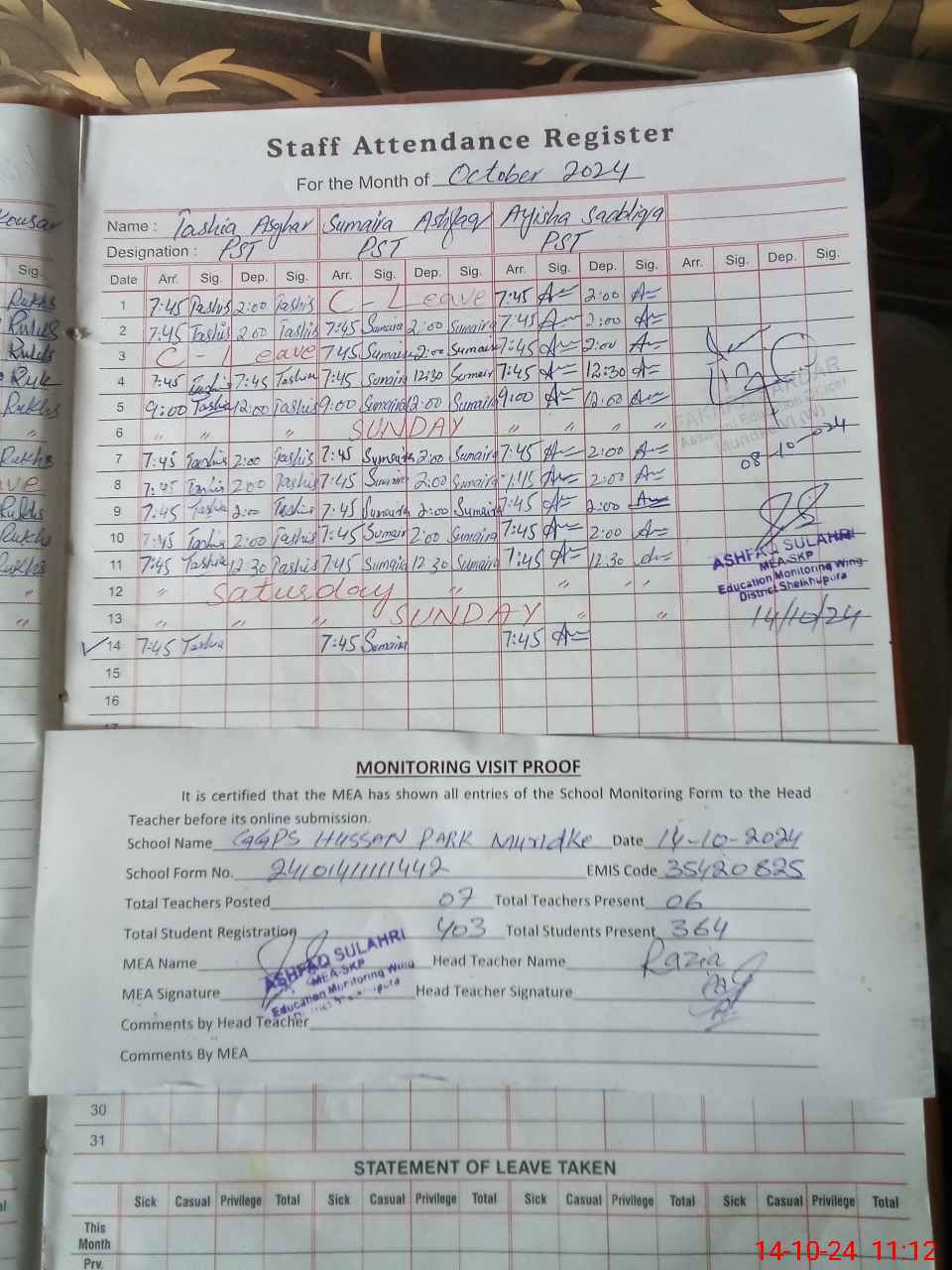 | EMIS Code: 35420825 | Name of School: GGPS HASSAN PARK MURIDKE | |||