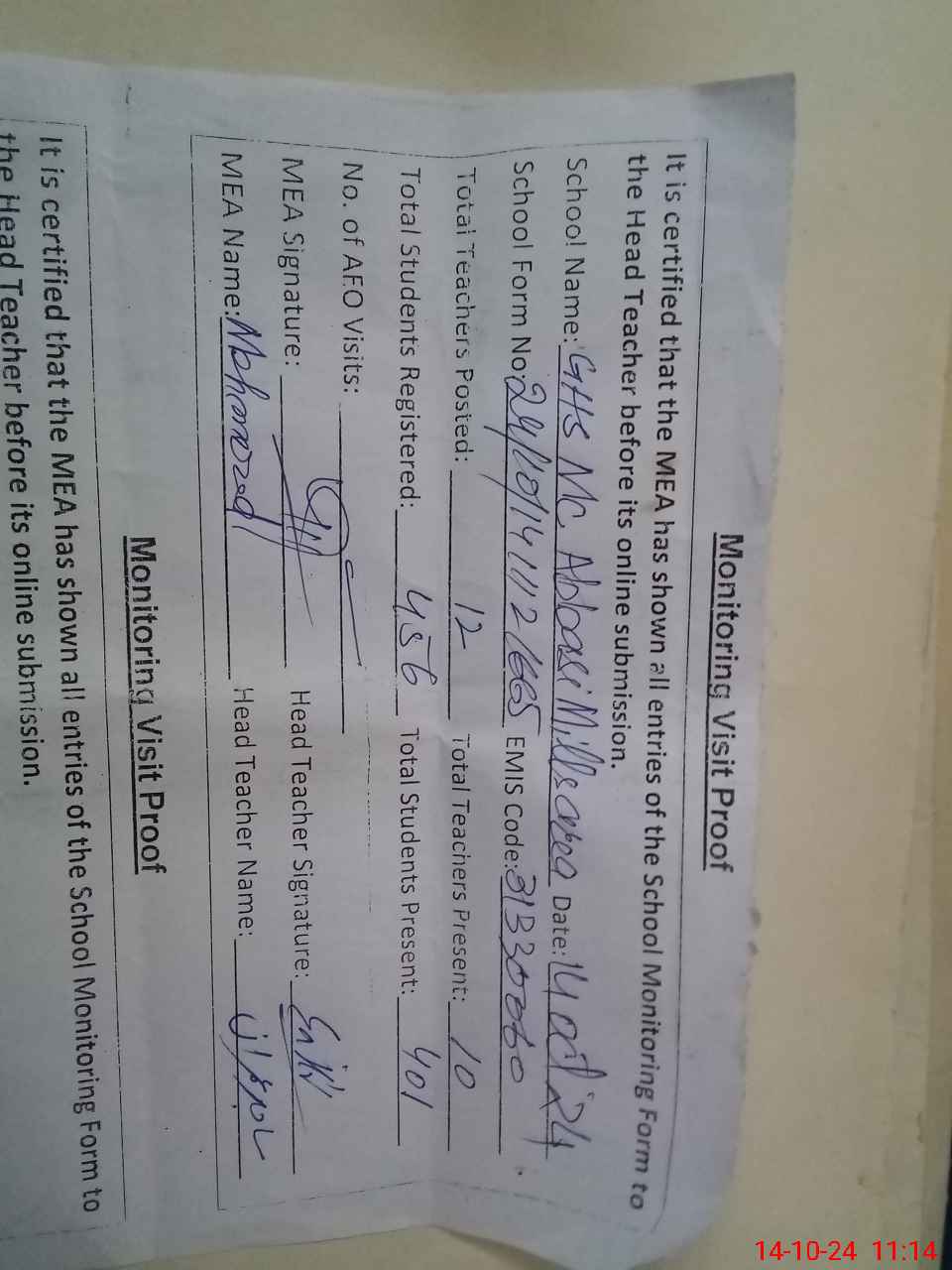 | Monitoring Date: 14-10-2024 | Start Time: 14-10-2024 10:21 AM | End Time: 14-10-2024 11:14 AM | Name of MEA: Ma**** UlHa**** | |