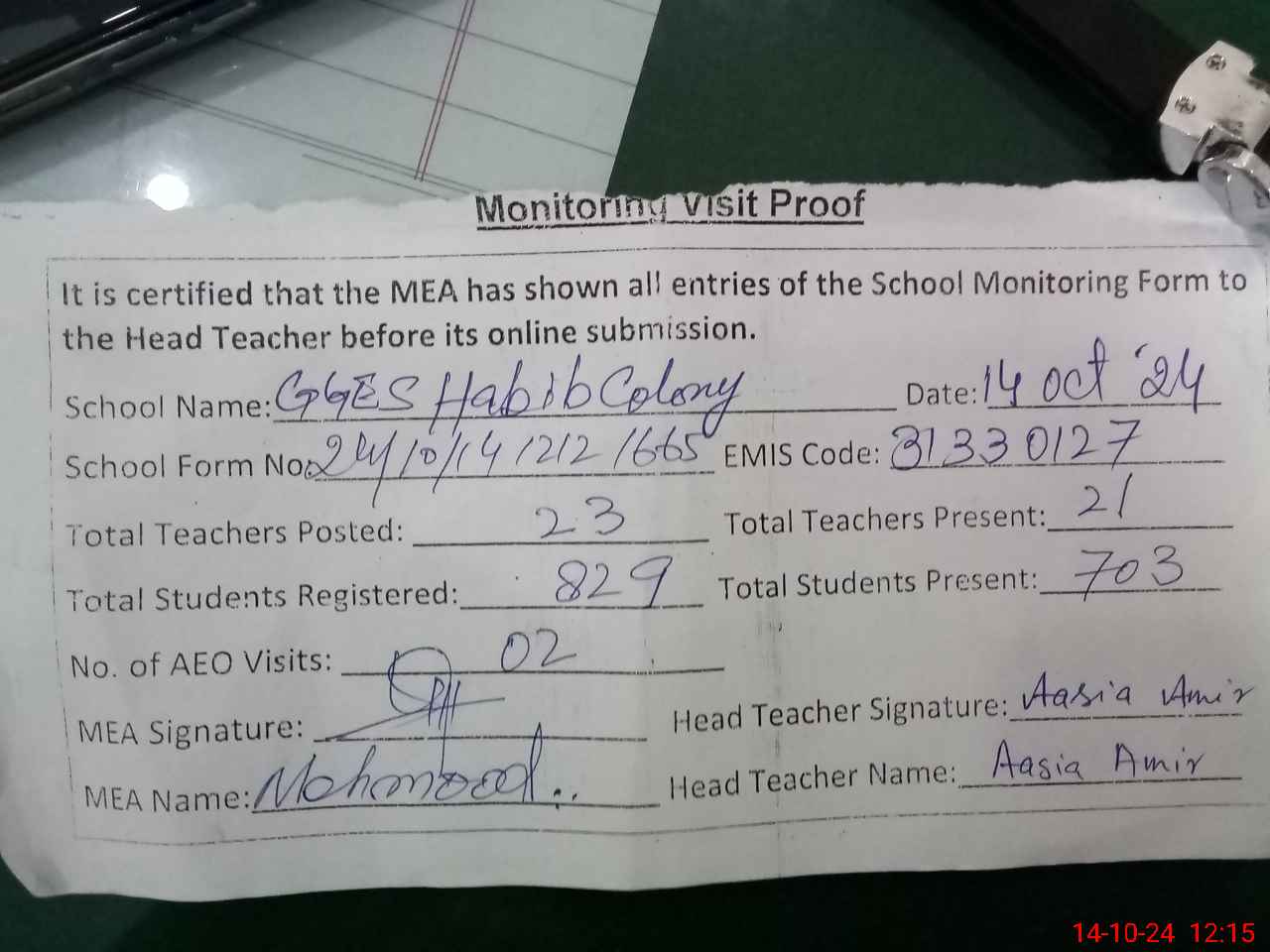 | Attendance Register | Head Teacher | MEA with School | Visit Proof |