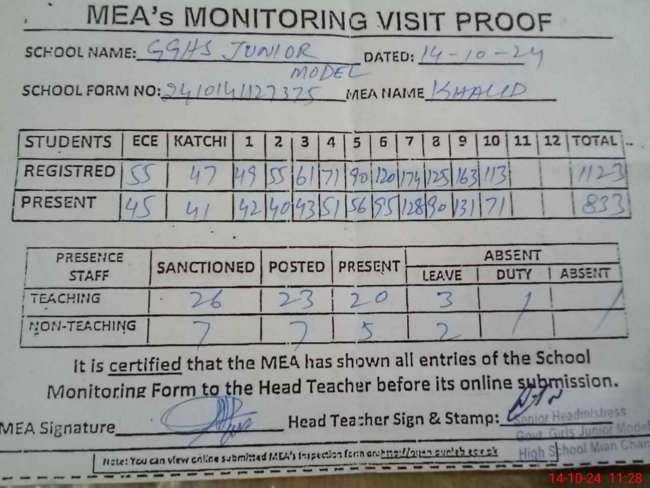 | Attendance Register | Head Teacher | MEA with School | Visit Proof |