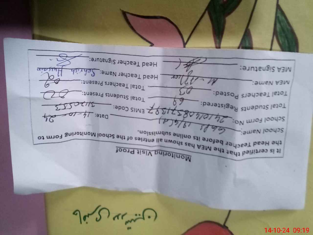| Certified that this School was Inspected by the Undersigned MEA/DMO Today and the Information Stated Above is as Per Record. | |||||