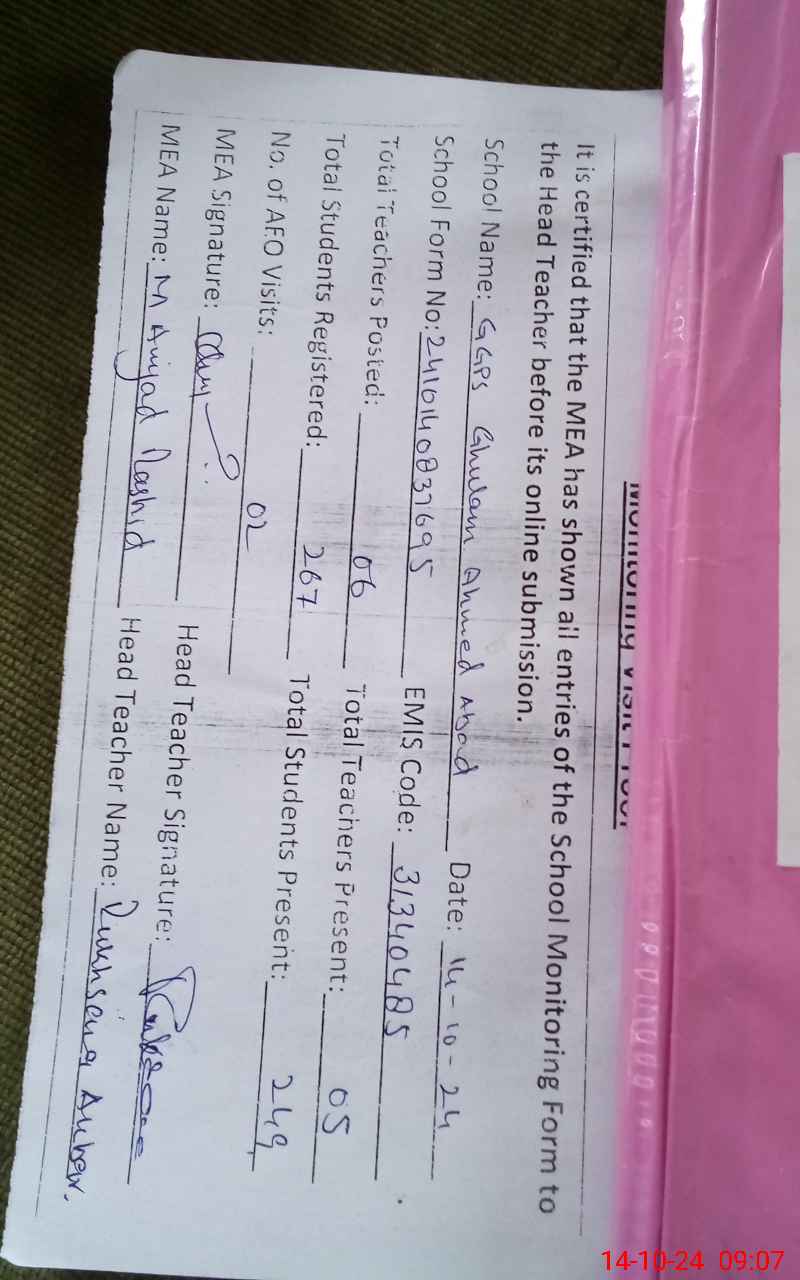 | EMIS Code: 31340485 | Name of School: GGPS GHULAM AHMAD ABAD | |||