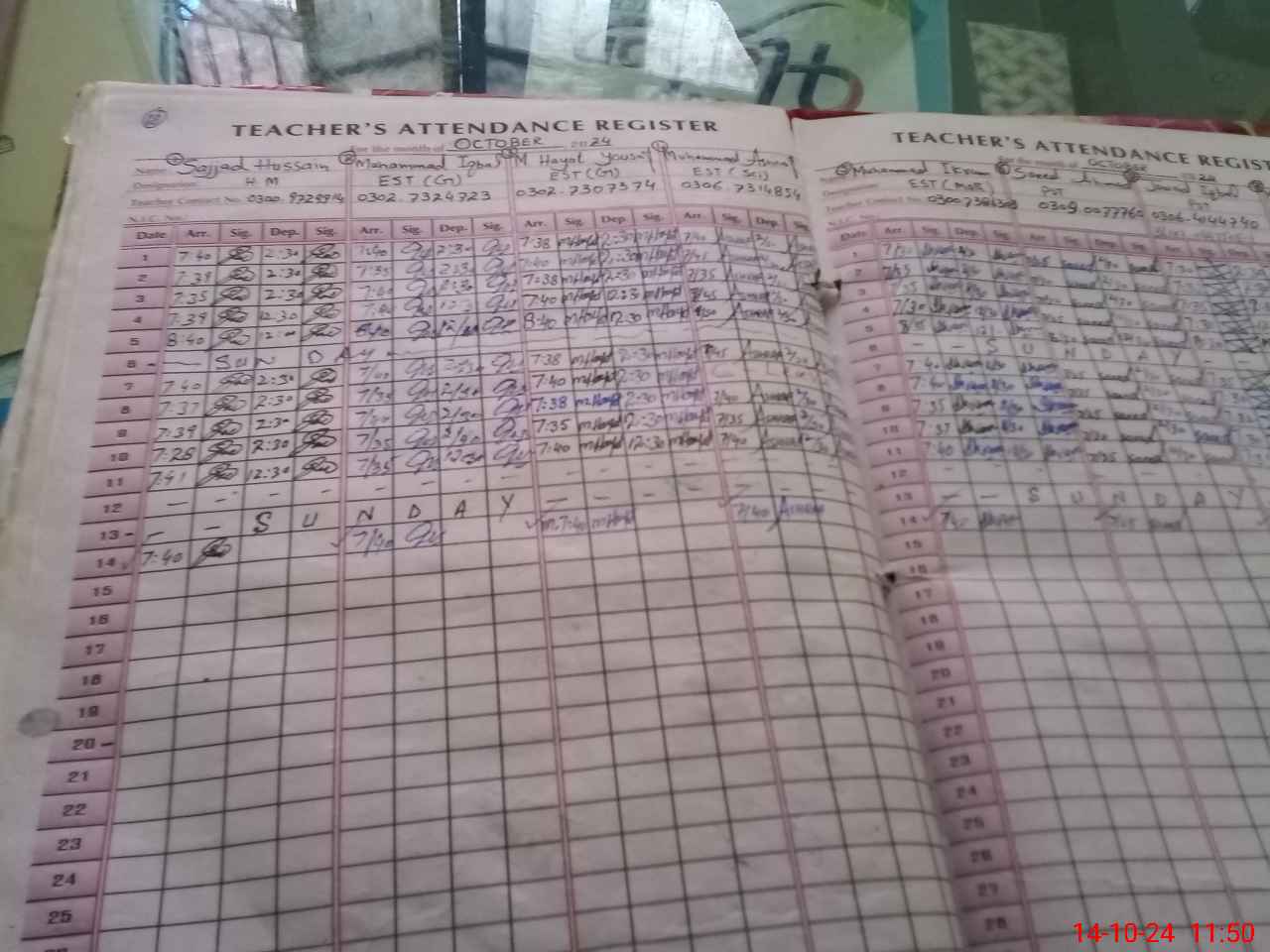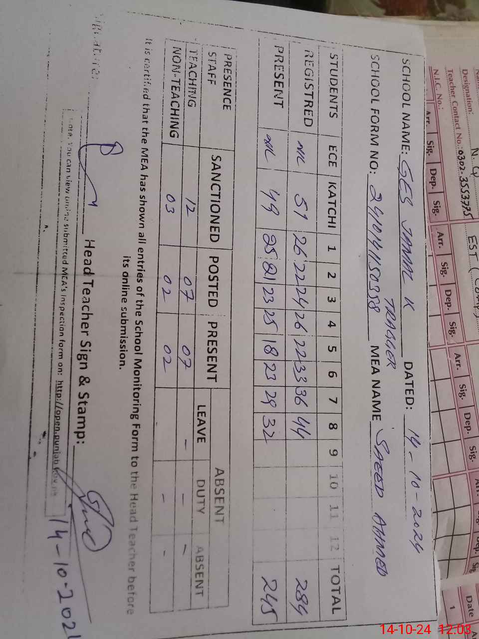 | Name: SA**** HU**** Designation: (School Headmaster's/Headmistress's) S.S.T Phone/Cell Number: 03**** |