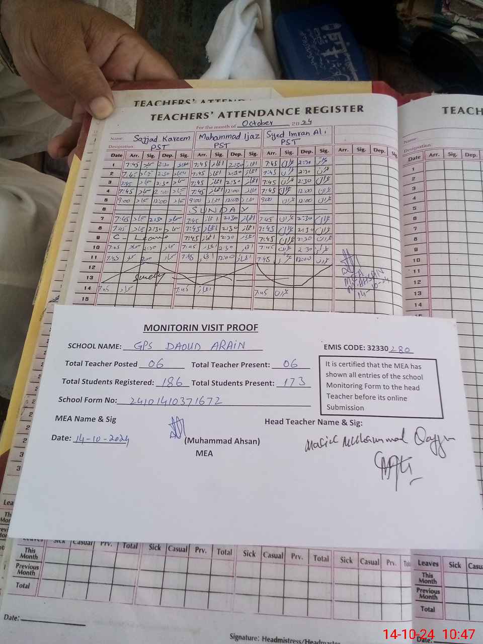 | Attendance Register | Head Teacher | MEA with School | Visit Proof |