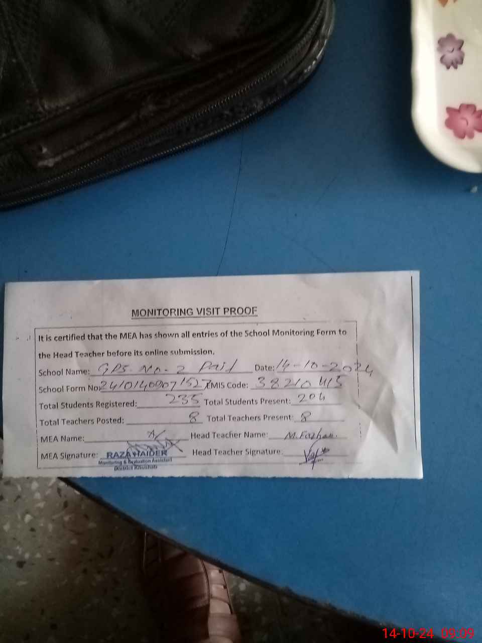 | Attendance Register | Head Teacher | MEA with School | Visit Proof |