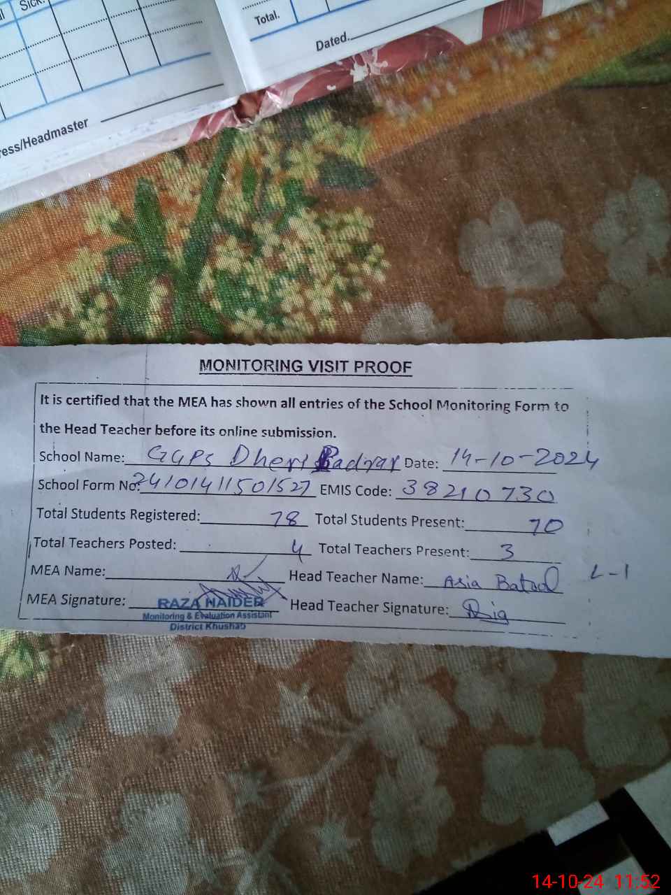 | EMIS Code: 38210730 | Name of School: GGPS DHERI PADHRAR | |||