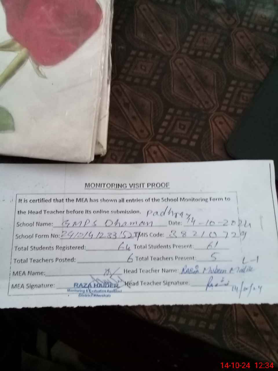 | Attendance Register | Head Teacher | MEA with School | Visit Proof |